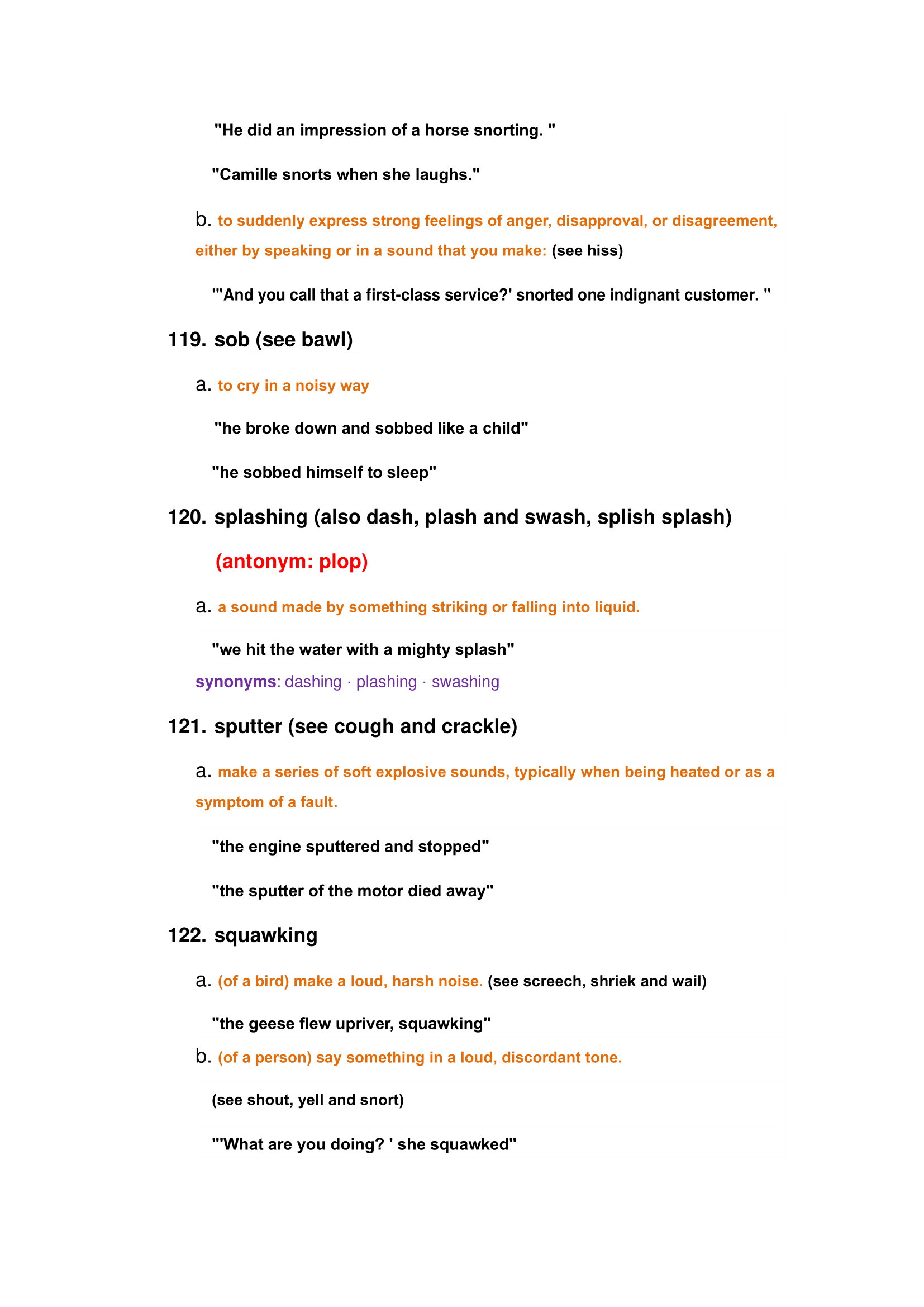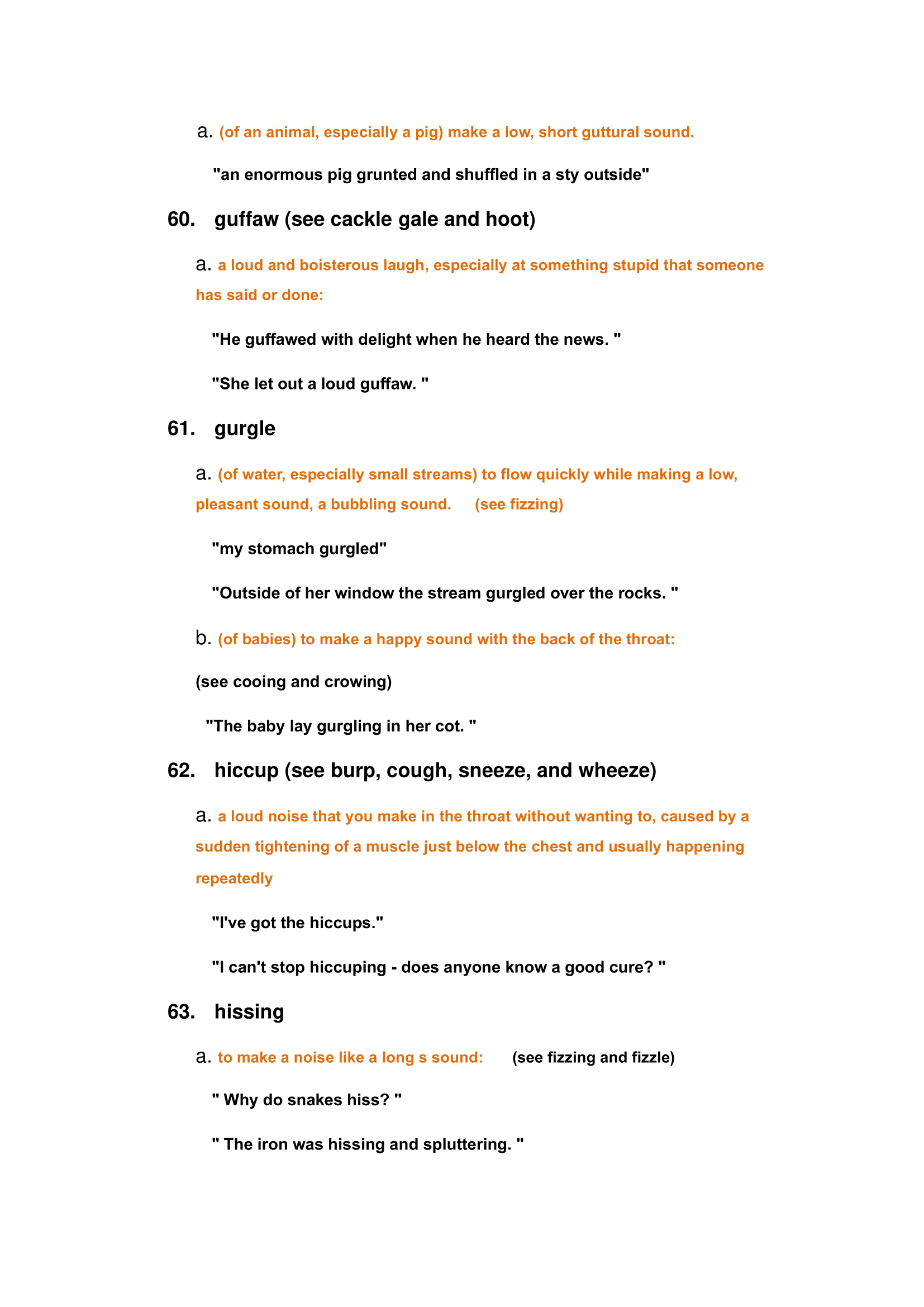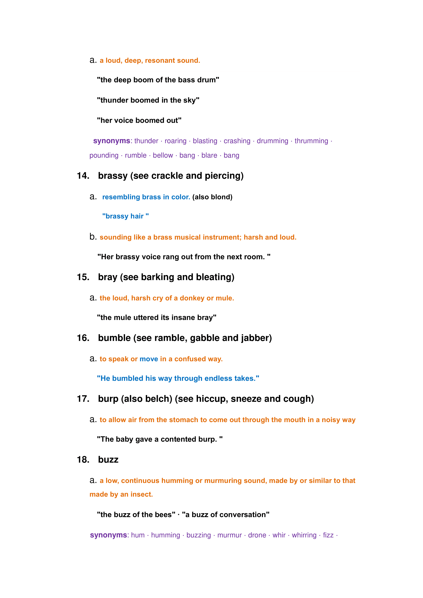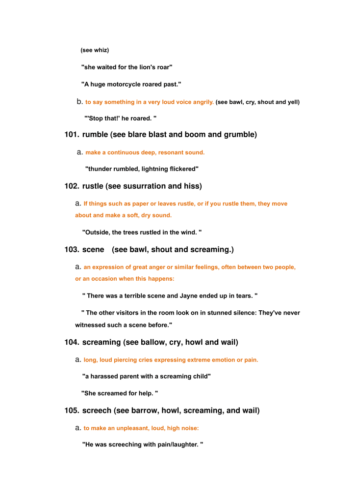 Characteristics of animals and nature sounds: roar, bleating, crash, creek, purring, susurration, whine, etc.