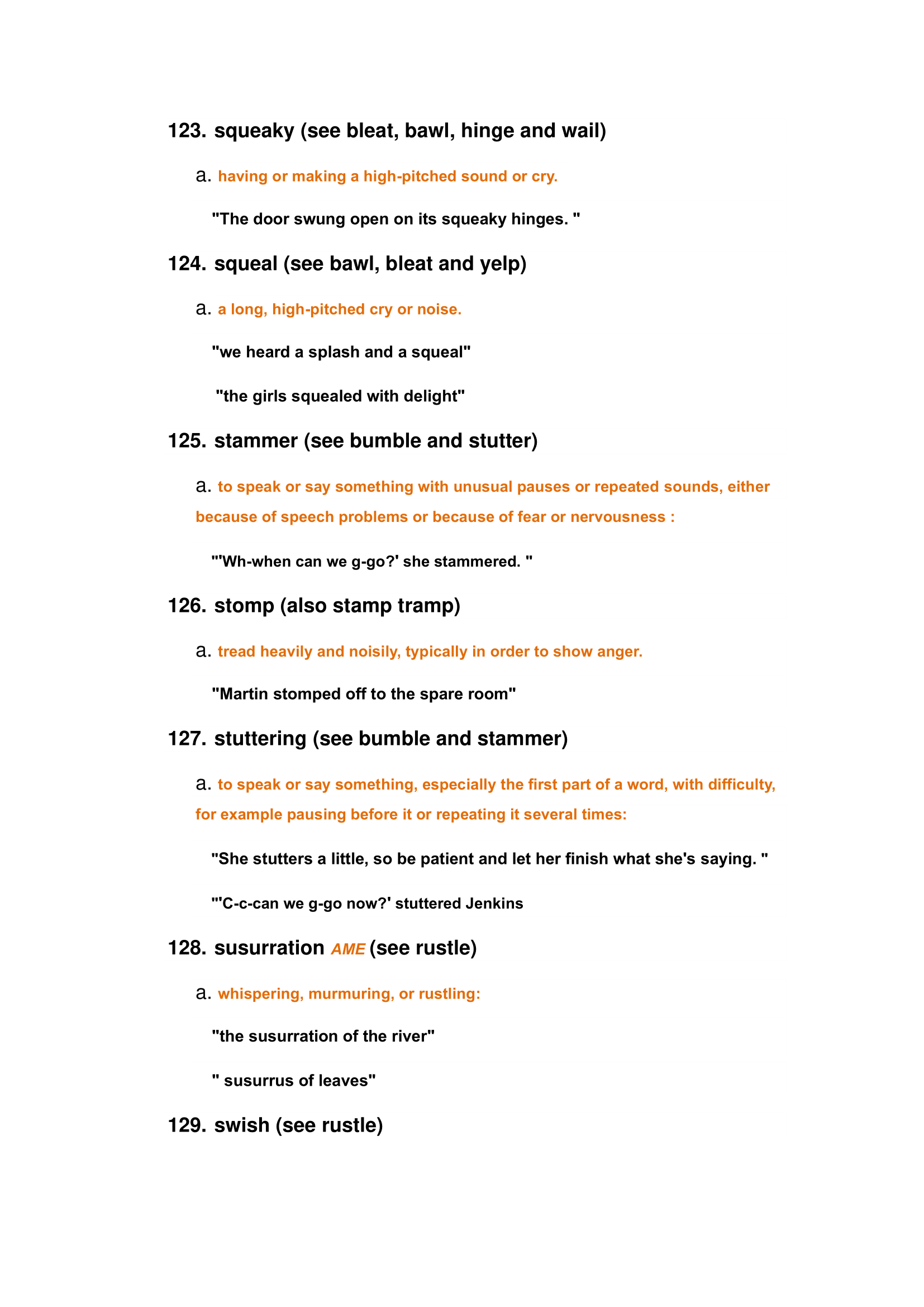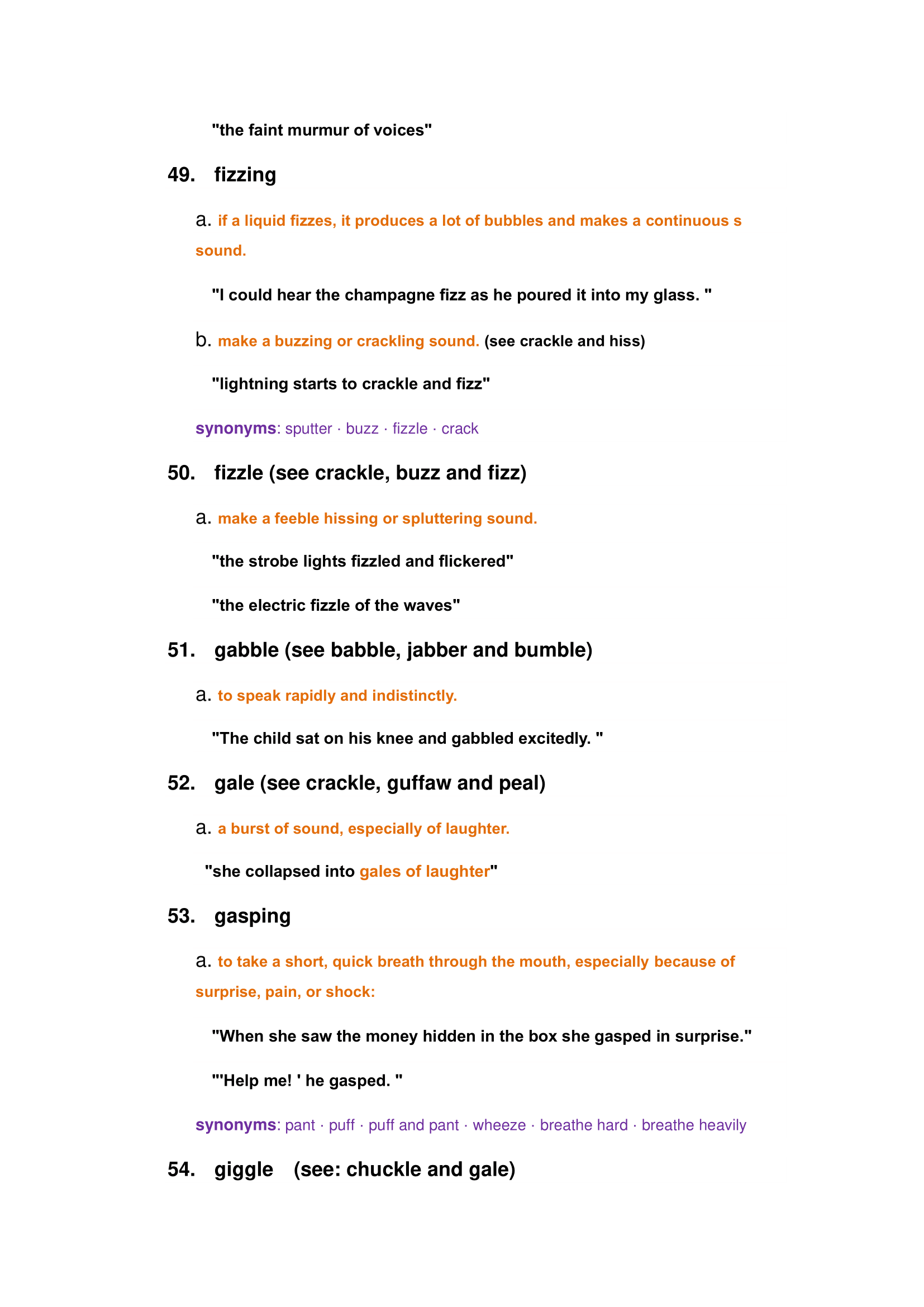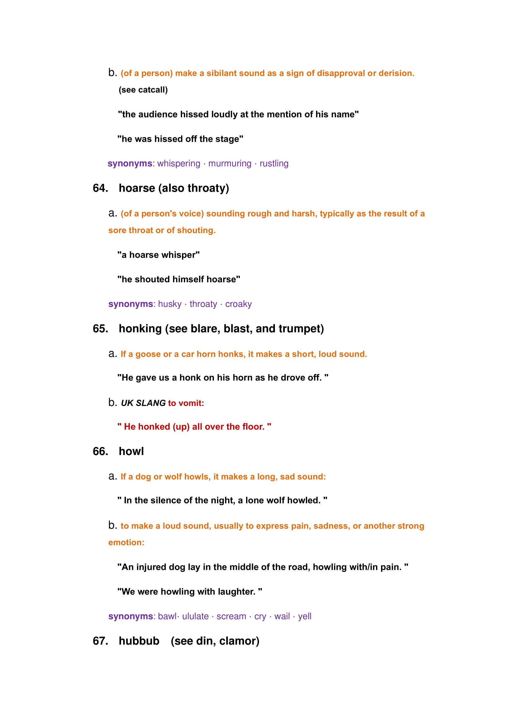 Characteristics of animals and nature sounds: roar, bleating, crash, creek, purring, susurration, whine, etc.