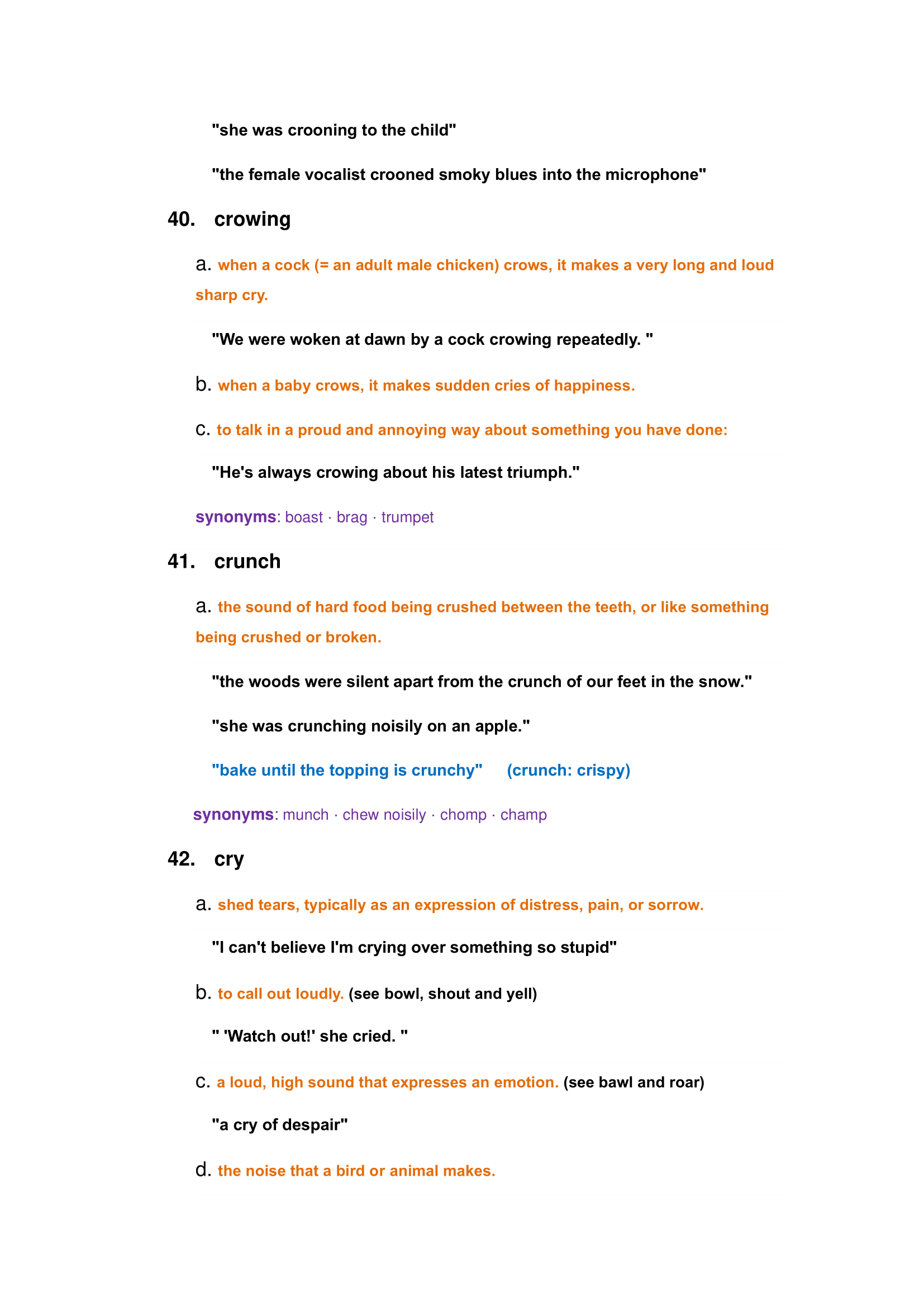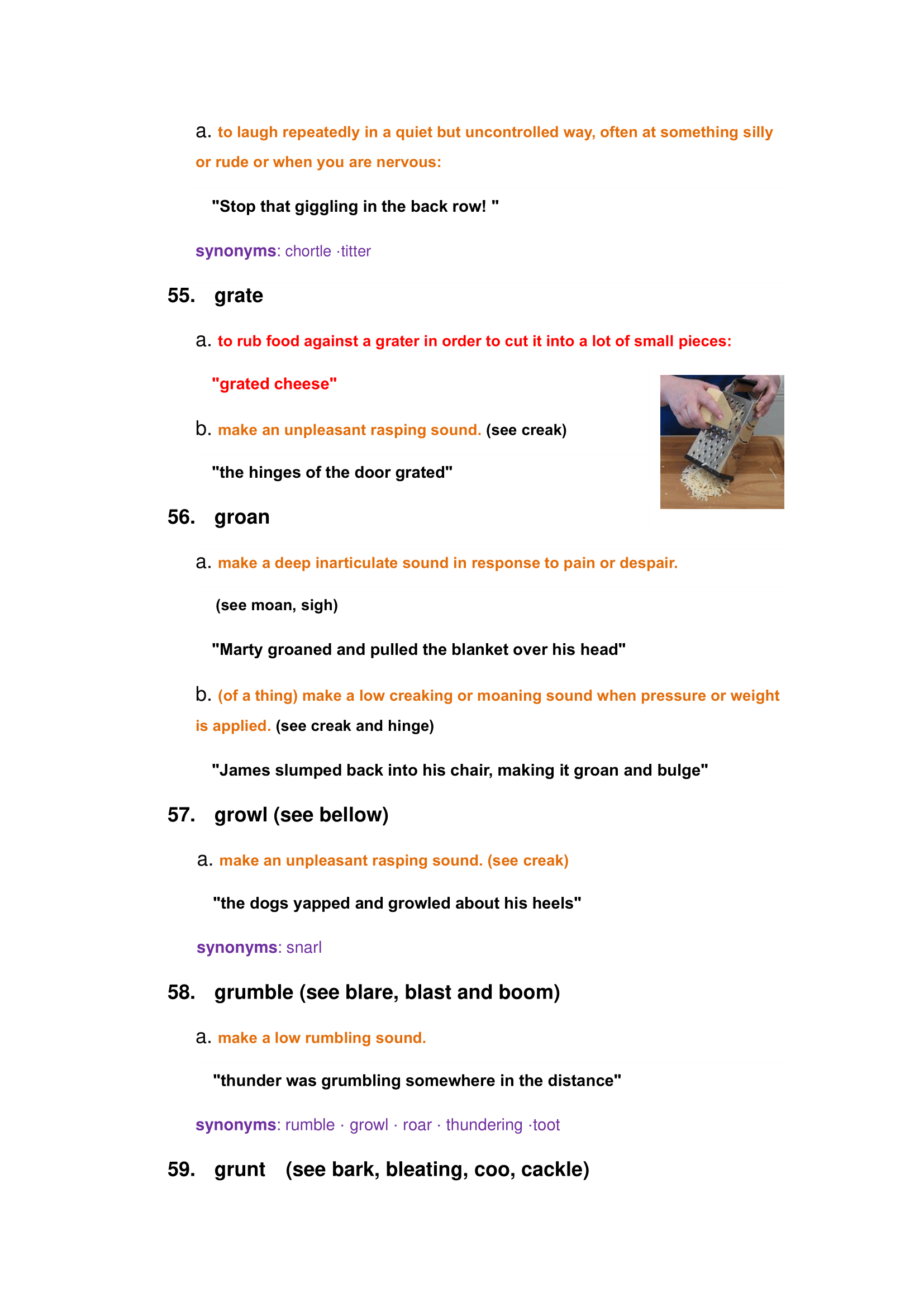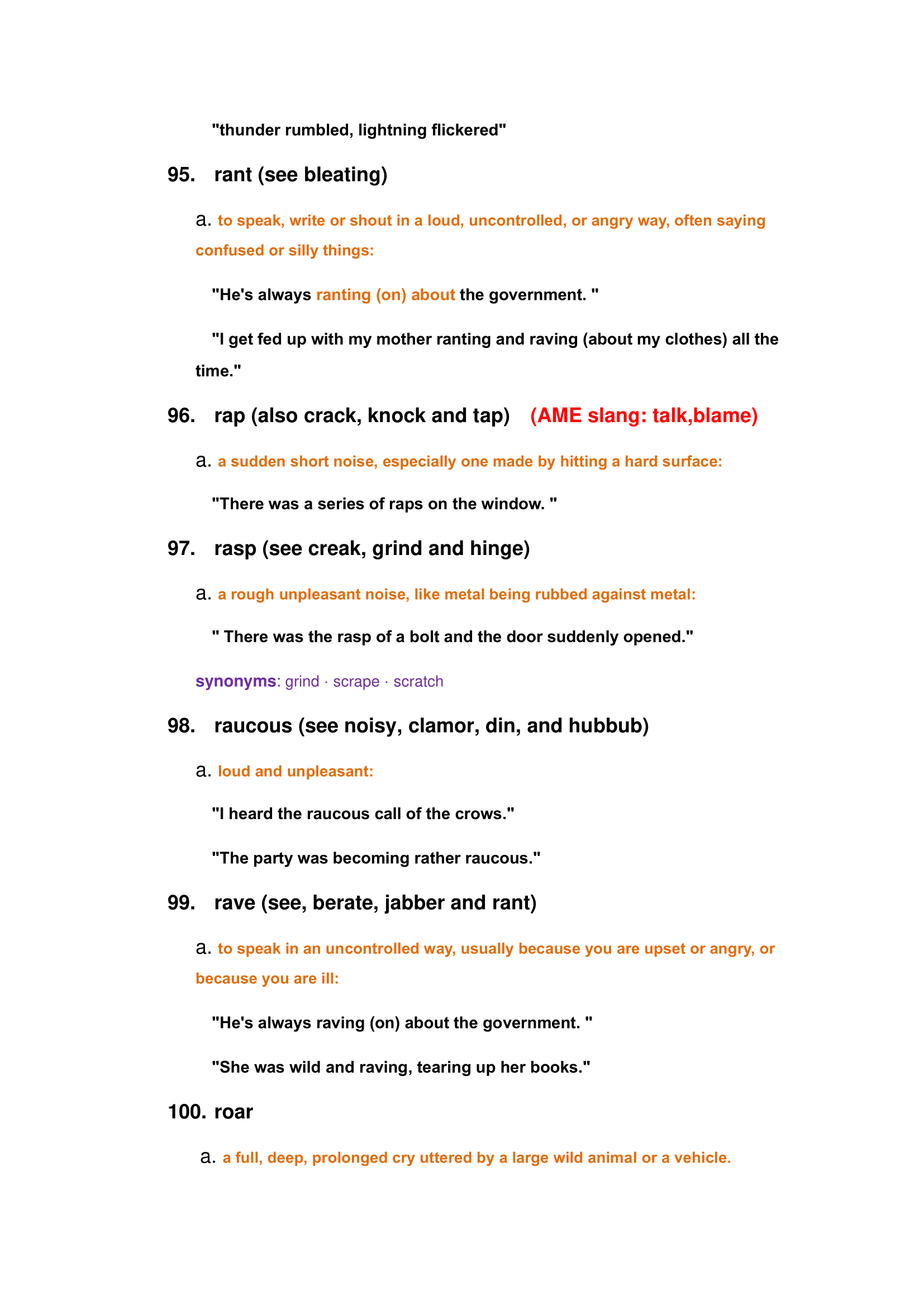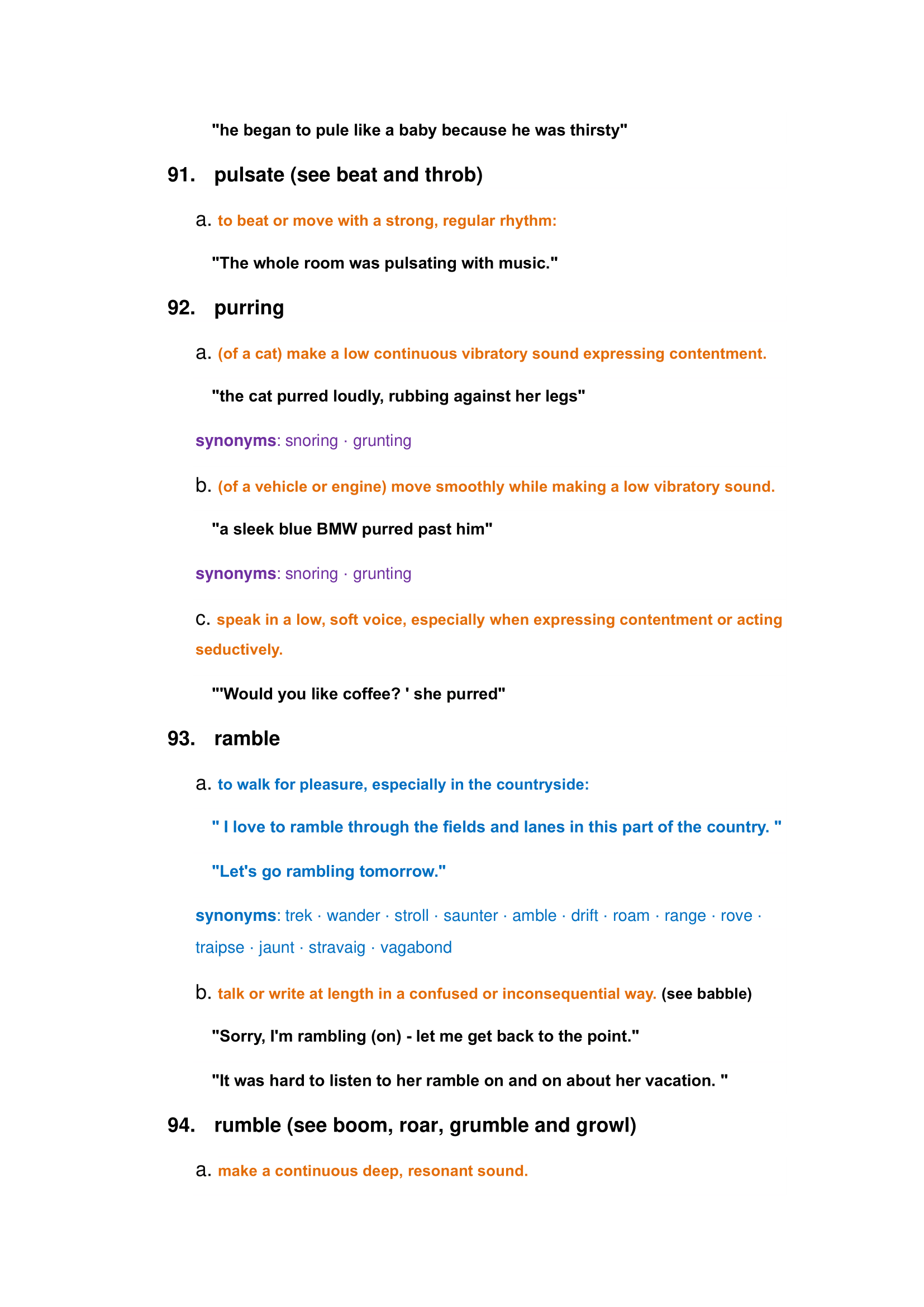 Characteristics of animals and nature sounds: roar, bleating, crash, creek, purring, susurration, whine, etc.