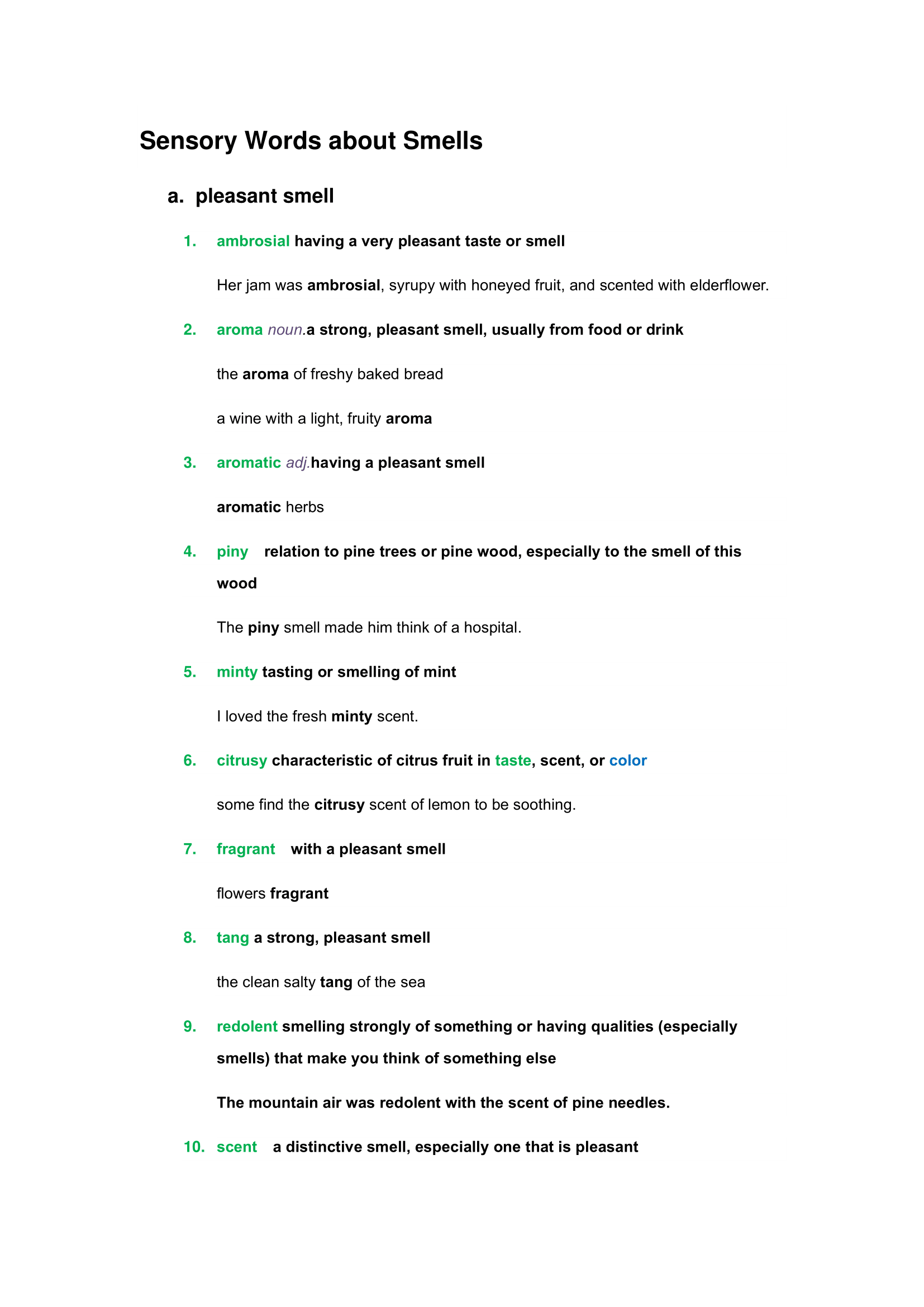 Taste, Flavor, and Smell sensory words describe the sensory experiences associated with food and aromas. These words can convey the richness of flavors. They illustrate the subtleties of scent. They describe the overall sensory experience of tasting and smelling. The lists include terms related to sweetness, bitterness, and spiciness. They also cover other flavor profiles. Descriptors for different scents, such as floral, pungent, or earthy, are included as well. While this list focuses on taste and smell, it also includes emotional alike sensory experiences.