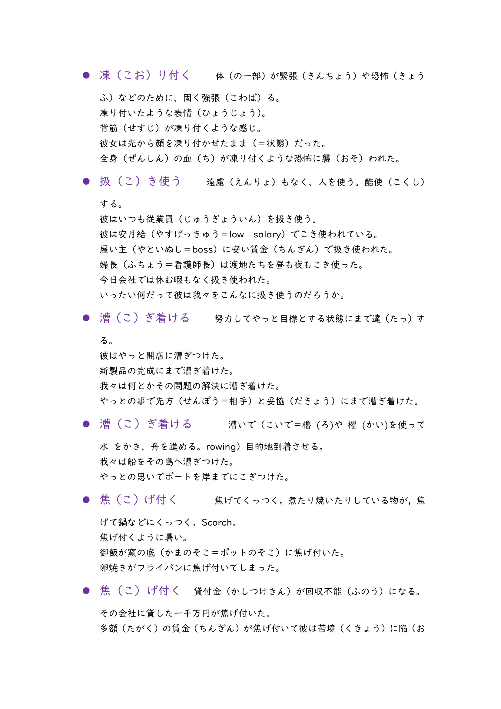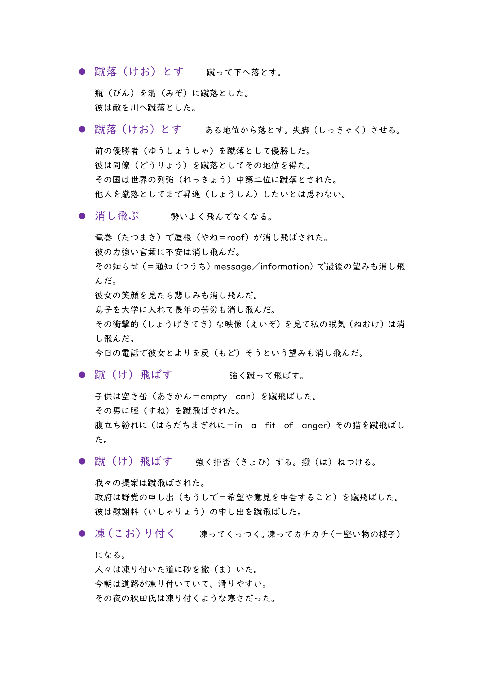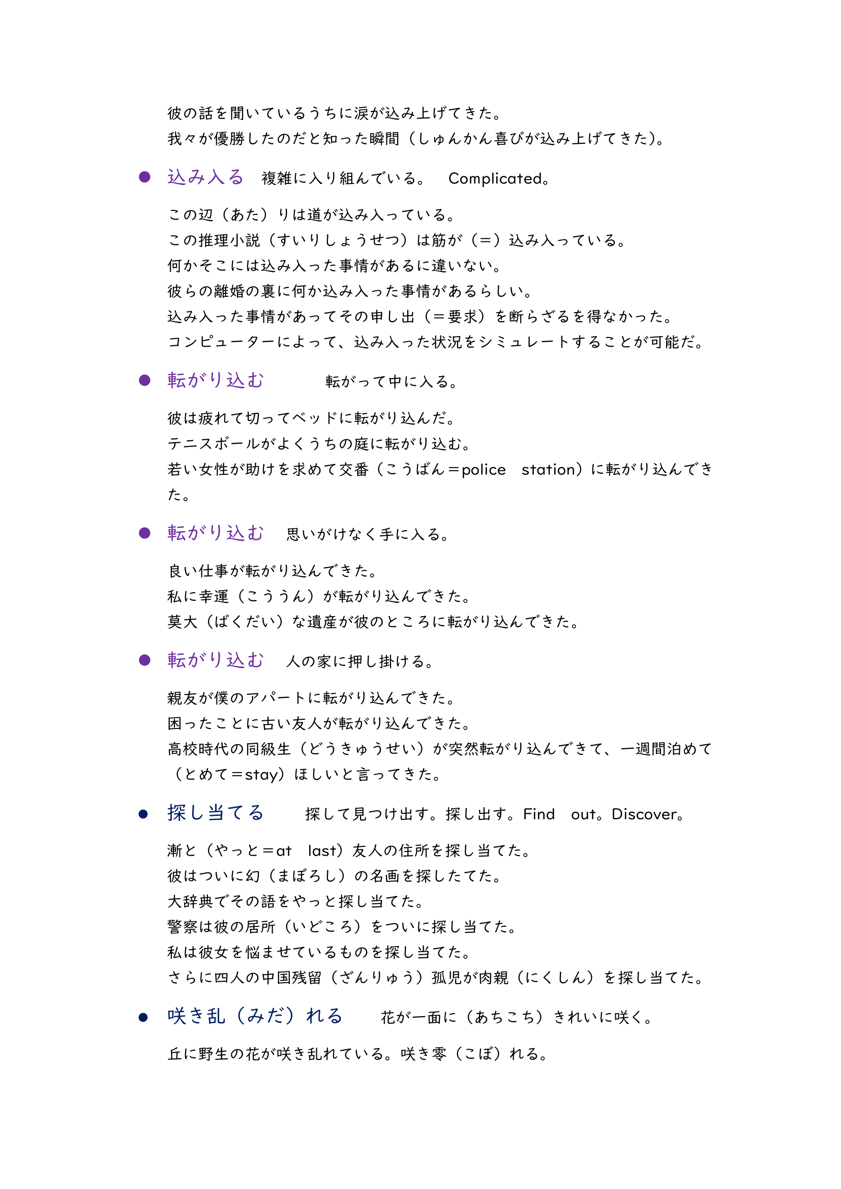 These vocabulary lists are about Japanese compound verbs. When you learn Japanese you would see a lot of verbs like “i” verbs or “u” verbs, they are basic, but if you read more Japanese materials there would be a lot of compound verbs which look like “光り輝く”,”投げ入れる” and “書き上げる”.