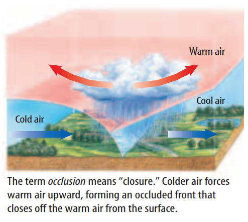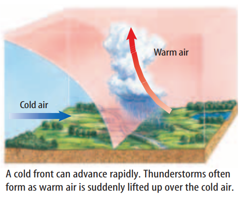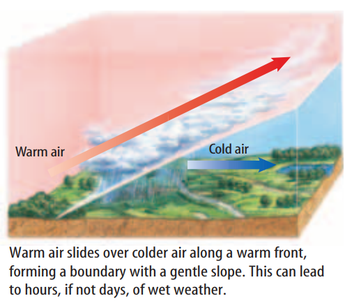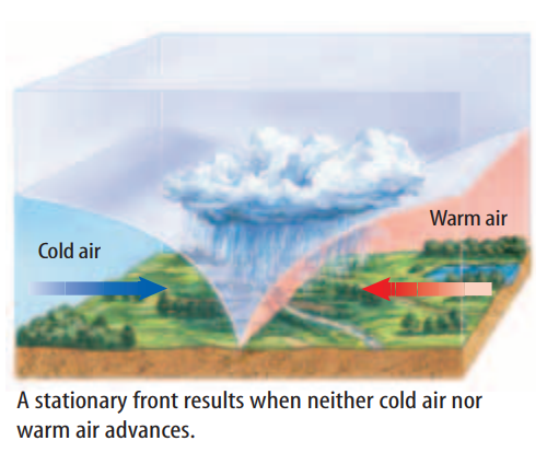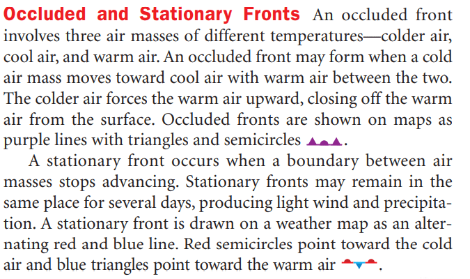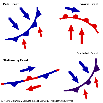 Cloudiness, precipitation, and storms sometimes occur at frontal boundaries. Four types of fronts include cold, warm, occluded, and stationary.