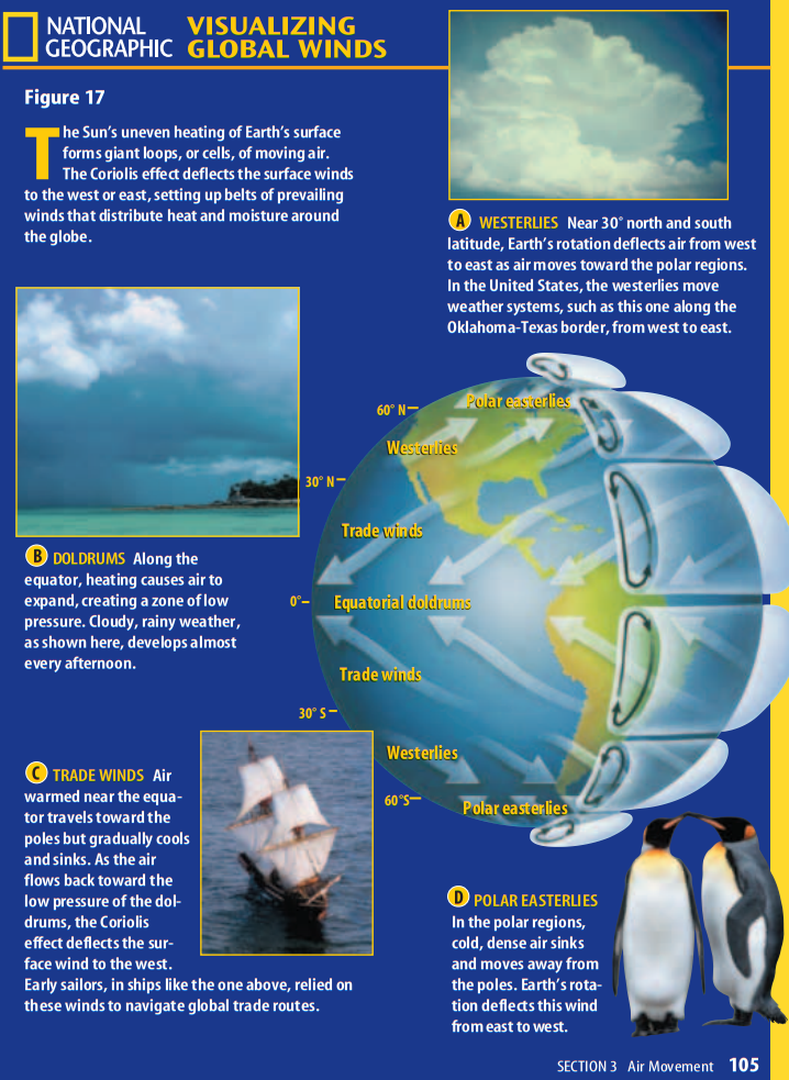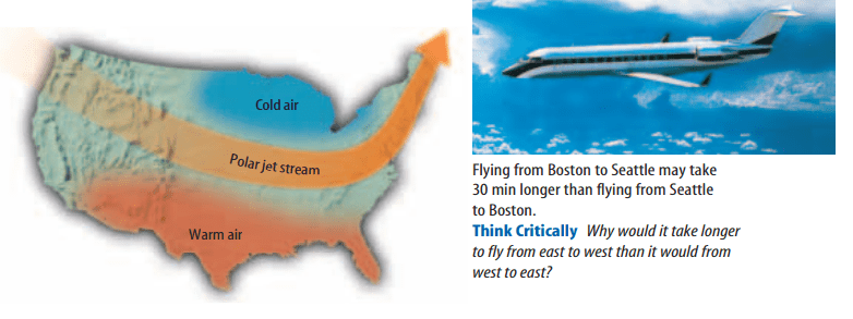 latitudes, warming the land regions they pass. When the currents cool off and flow back toward the equator, they cool the air and climates of nearby land. Winds blowing from the sea are often moister than those blowing from land.
