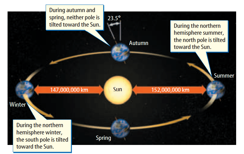 During the year, the high latitudes near the poles have great differences in temperature and number of daylight hours. As shown in Figure 8, during summer in the northern hemisphere, the north pole is tilted toward the Sun. During summer at the north pole, the Sun doesn’t set for nearly six months. During that same time, the Sun never rises at the south pole. At the equator days are about the same length all year long.