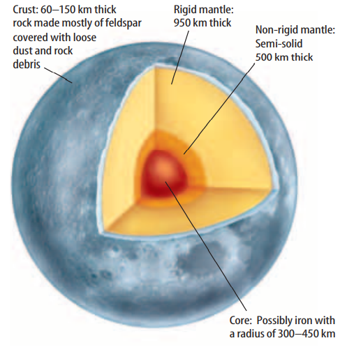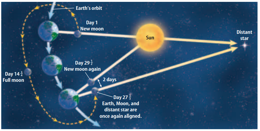 The Moon revolves around Earth at an average distance of about 384,000 km. It takes 27.3 days for the Moon to complete one orbit around Earth. The Moon also takes 27.3 days to rotate once on its axis. Because these two motions of the Moon take the same amount of time, the same side of the Moon is always facing Earth. Examine Figure 9 to see how this works.