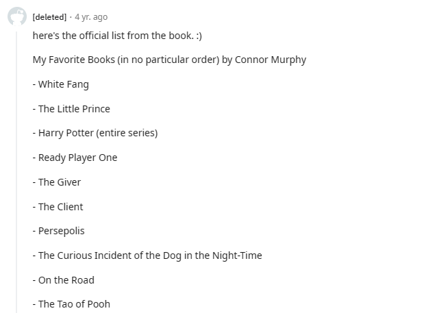 A few days ago I watched a musical named Dear Evan Hansen, an inspirational story about social anxiety. I noticed there was a scene where Connor’s favorite books were on the desk which Evan Hansen had read to know about Connor. Trying to recognize the book titles, I got some book covers. Then I googled and found the full list of those books on Reddit: