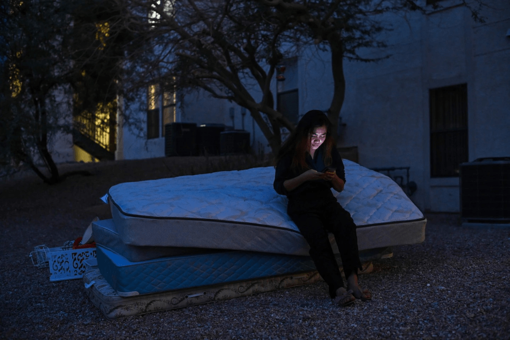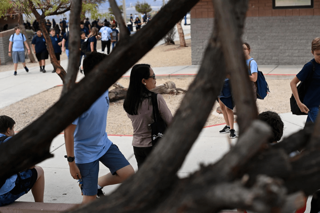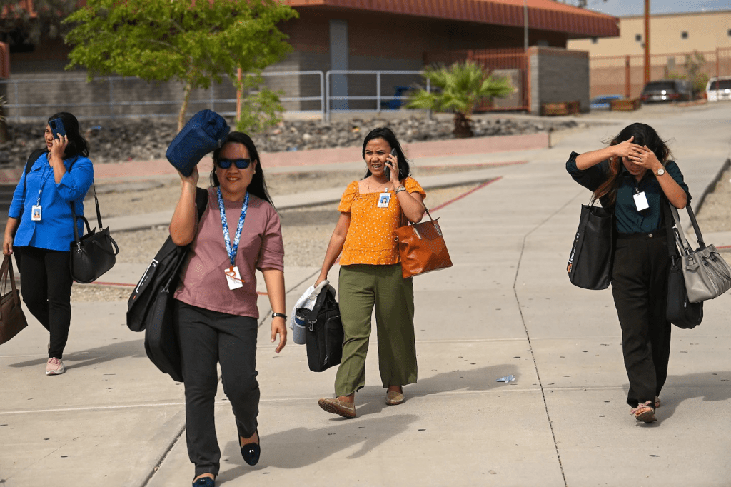 She left the airport in a car with three other Filipino teachers and pressed her phone against the window to photograph the casino hotels, the downtown high-rises, the glistening pools of the suburbs and the neat rows of palm trees on the outskirts of town. Civilization began to give way to red dirt and jagged rock formations. The car’s thermometer showed an outside temperature of 114 degrees. Obreque put away her phone and watched heat waves rise off the desert.