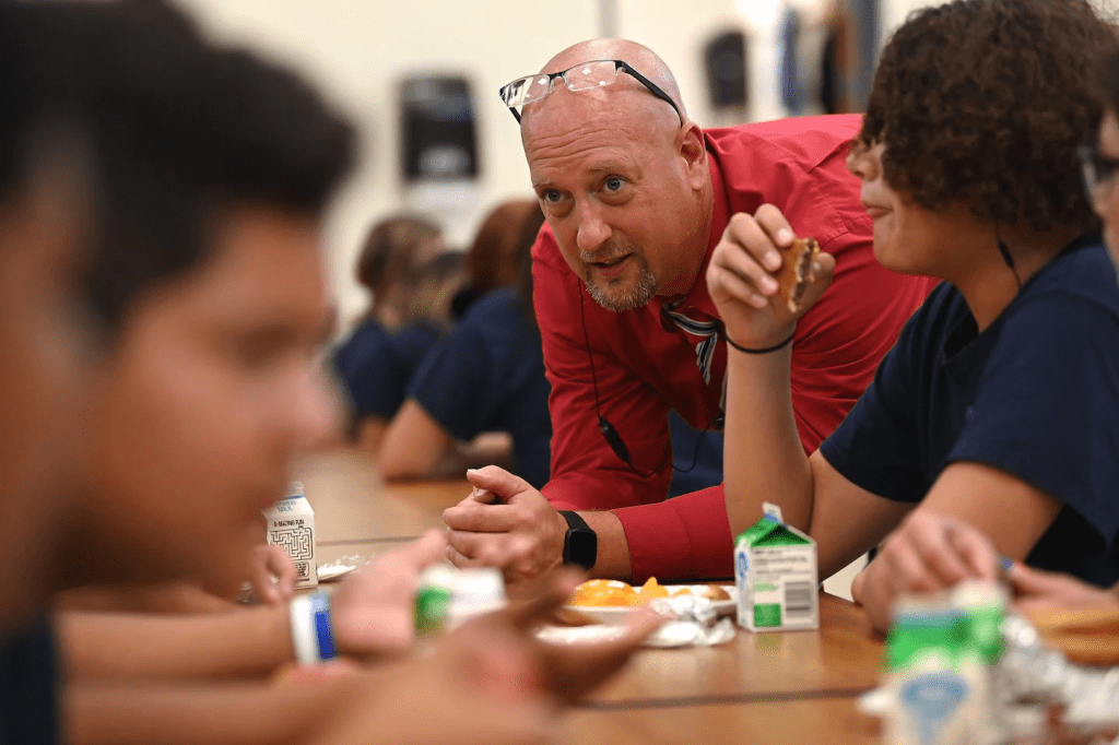 “Well, we’re going to give you a little time to adjust before we throw you in front of a class,” he said, and then he thought about what else he wanted to tell them about Fox Creek, and all the ways he could characterize their new school. There was its F letter grade from the state of Arizona, issued shortly before the pandemic. There were the standardized test scores that showed fewer than 20 percent of students were proficient in either English or math, and more than half were performing at least a few years below their grade level. There were the $4.5 billion in statewide education cuts over the past decade, which had left him with a shortened four-day school week and some of the lowest-paid teachers in the country. There was the fact that many of those teachers in the district were now working beyond retirement age and taking on extra classes because they refused to walk away from a student population that so many others had abandoned. There was the school dining room, where every student qualified for free or reduced-price meals. There was the continued fallout of the pandemic, which had decimated their working-class town of casino dealers and hotel service workers, killing almost 1 percent of the population. There was the scene that moved Eastman each morning, when 600 children from those same families managed to show up on time in matching blue Fox Creek shirts to a school he sometimes worried was failing them.