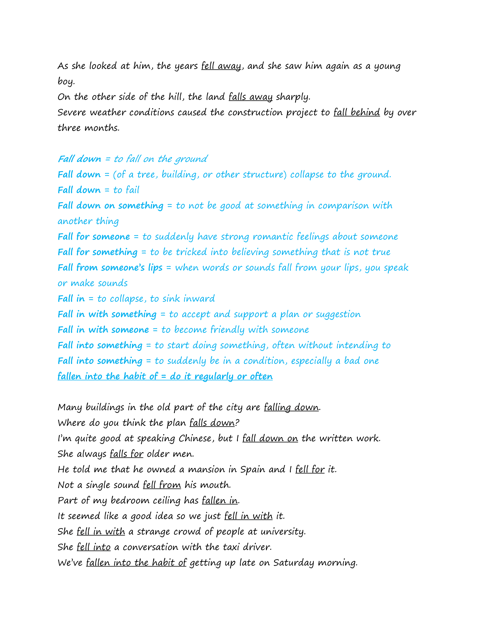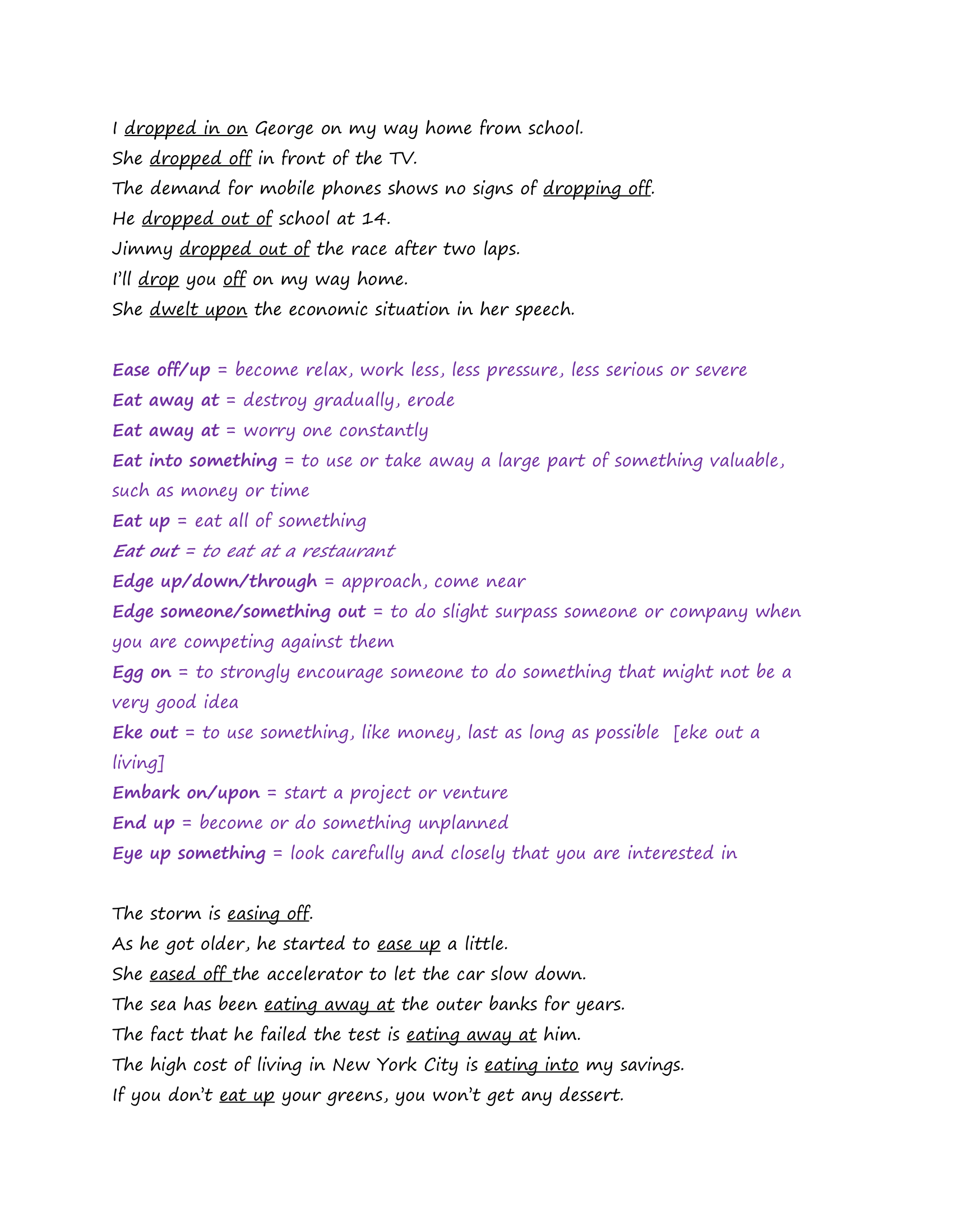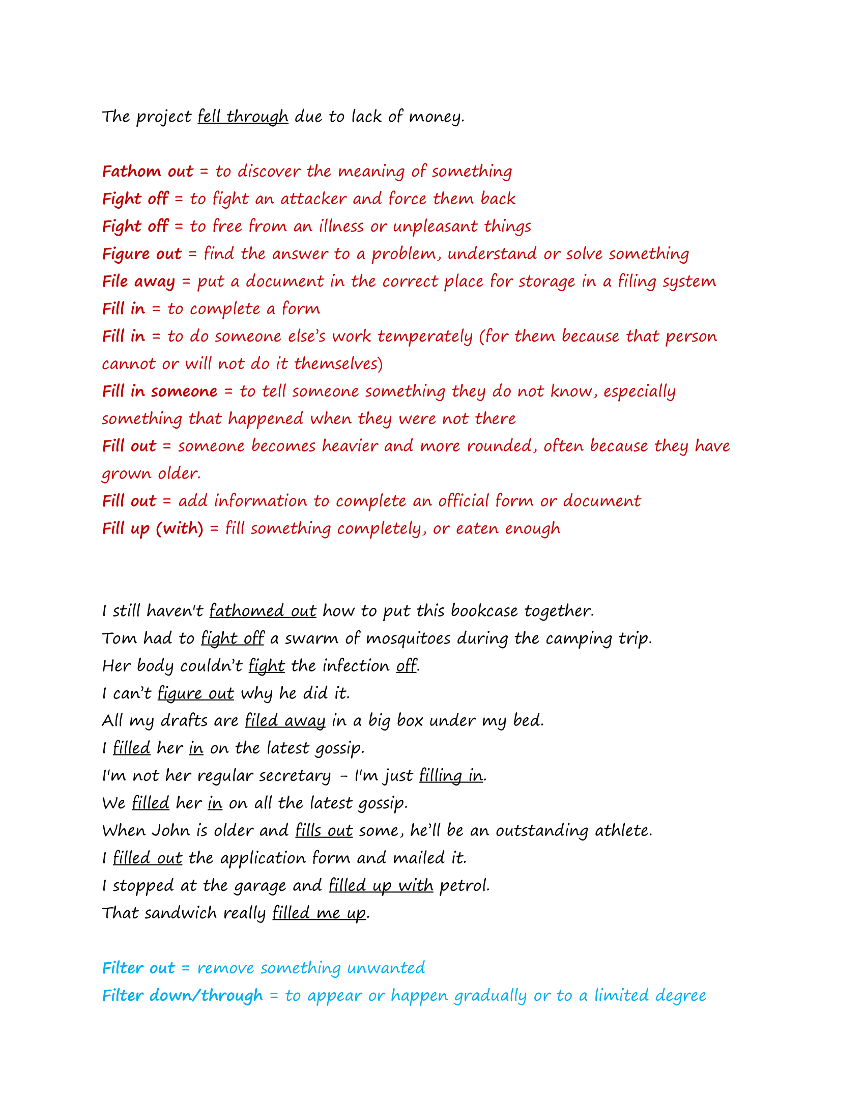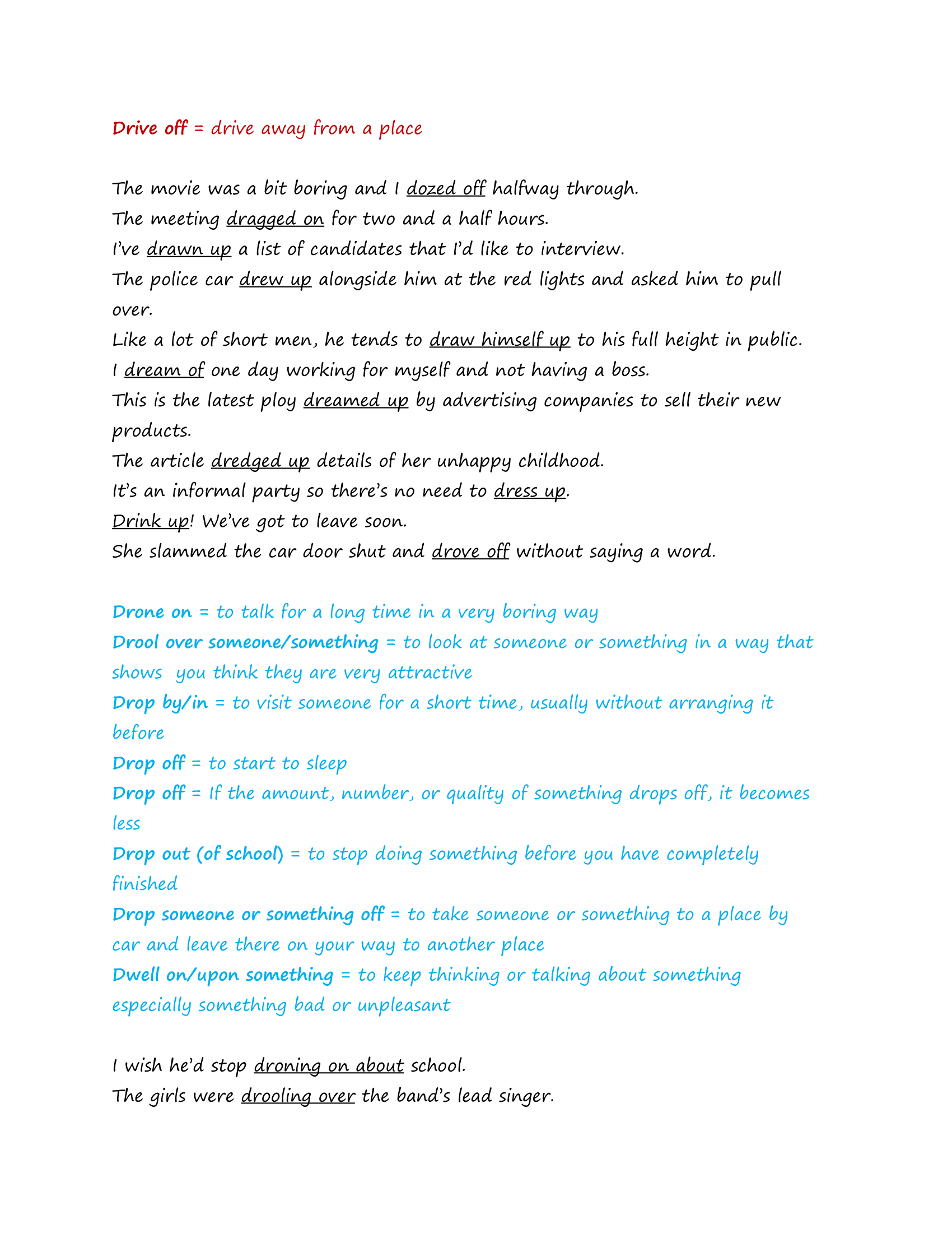 Phrasal verbs are part of a large group of verbs called ‘multi-word verbs’. Phrasal verbs and other multi-word verbs, including phrasal verbs, are very common, especially in Spoken English. A multi-word verb is a verb like ‘pick up’, ‘turn on’ or ’get on with’. For convenience, many people refer to all multi-word verbs as phrasal verbs. These verbs consist of a basic verb + another word or words. The other word(s) can be prepositions and/or adverbs. The two or three words that make up multi-word verbs form a short ‘phrase’ – which is why these verbs are often called ‘phrasal verbs’.