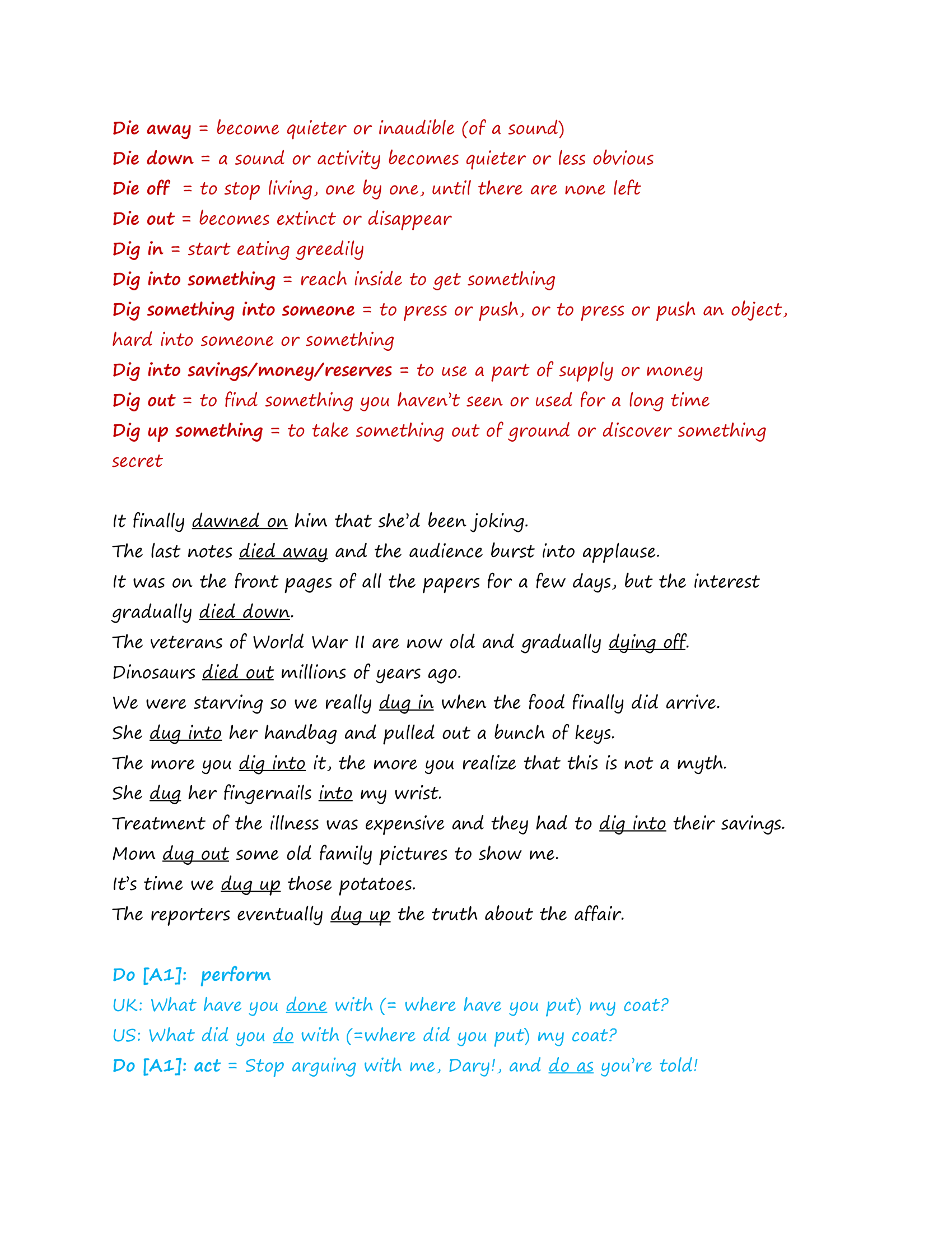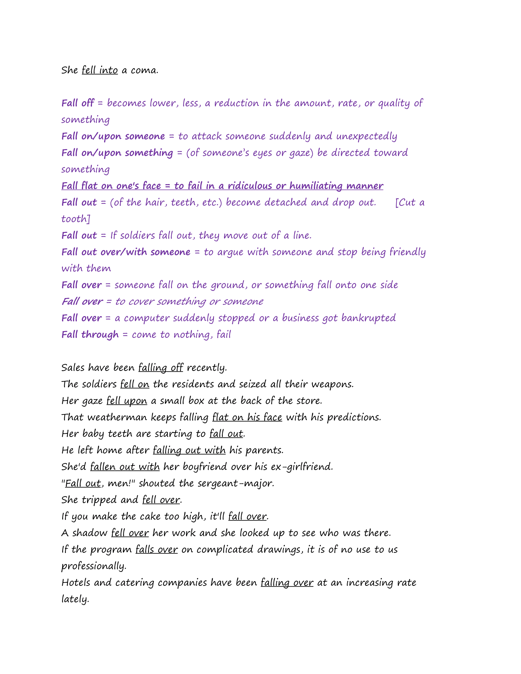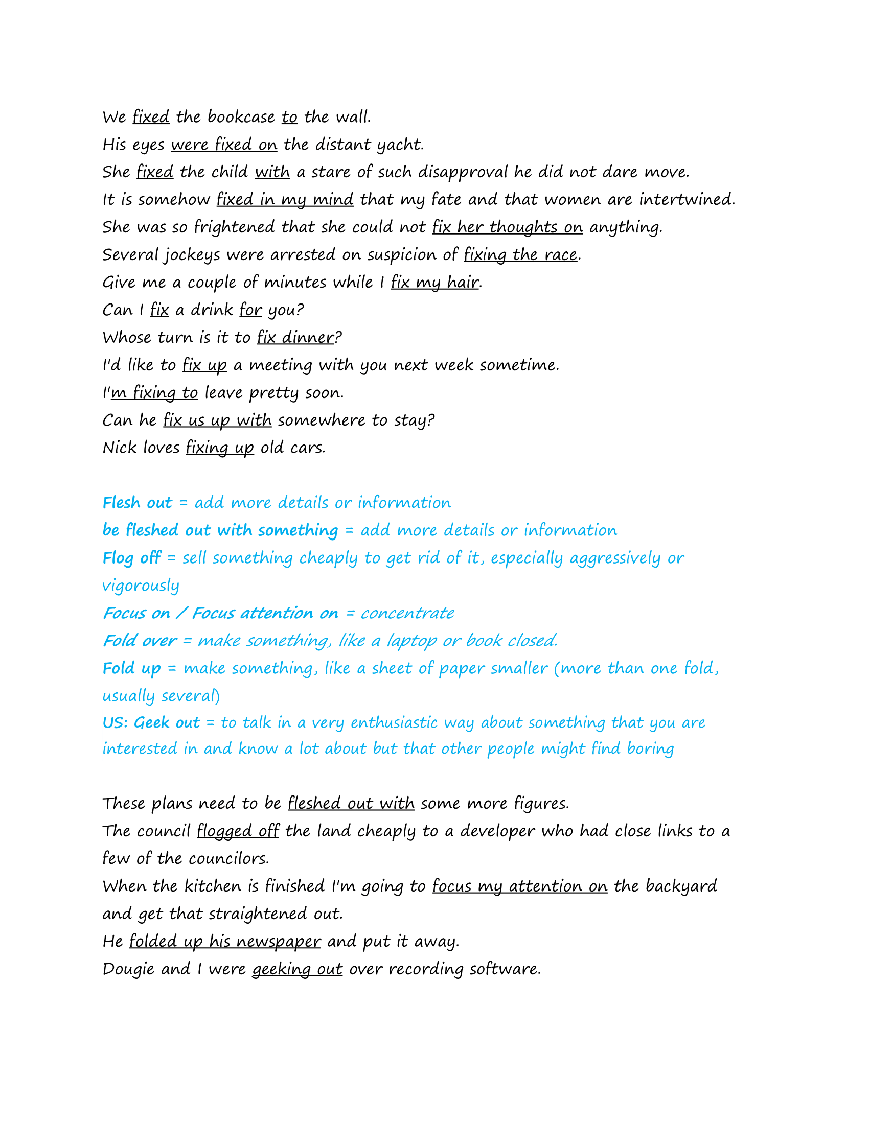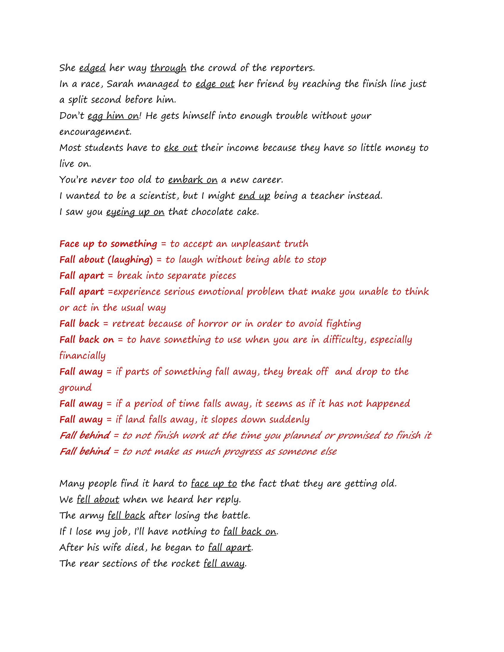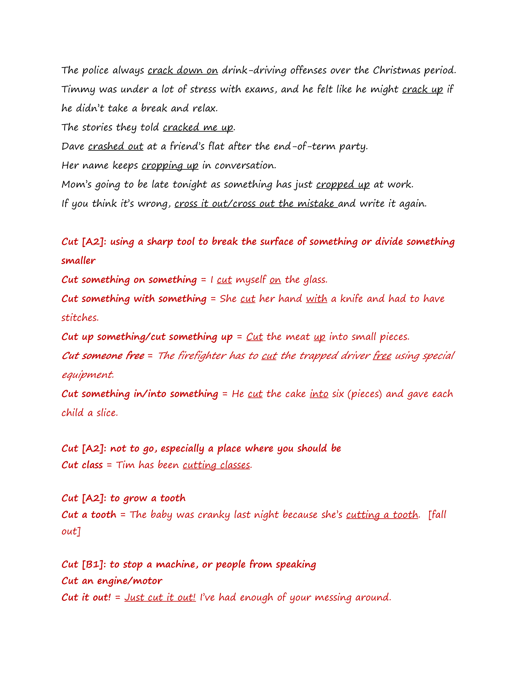 Phrasal verbs are part of a large group of verbs called ‘multi-word verbs’. Phrasal verbs and other multi-word verbs, including phrasal verbs, are very common, especially in Spoken English. A multi-word verb is a verb like ‘pick up’, ‘turn on’ or ’get on with’. For convenience, many people refer to all multi-word verbs as phrasal verbs. These verbs consist of a basic verb + another word or words. The other word(s) can be prepositions and/or adverbs. The two or three words that make up multi-word verbs form a short ‘phrase’ – which is why these verbs are often called ‘phrasal verbs’.