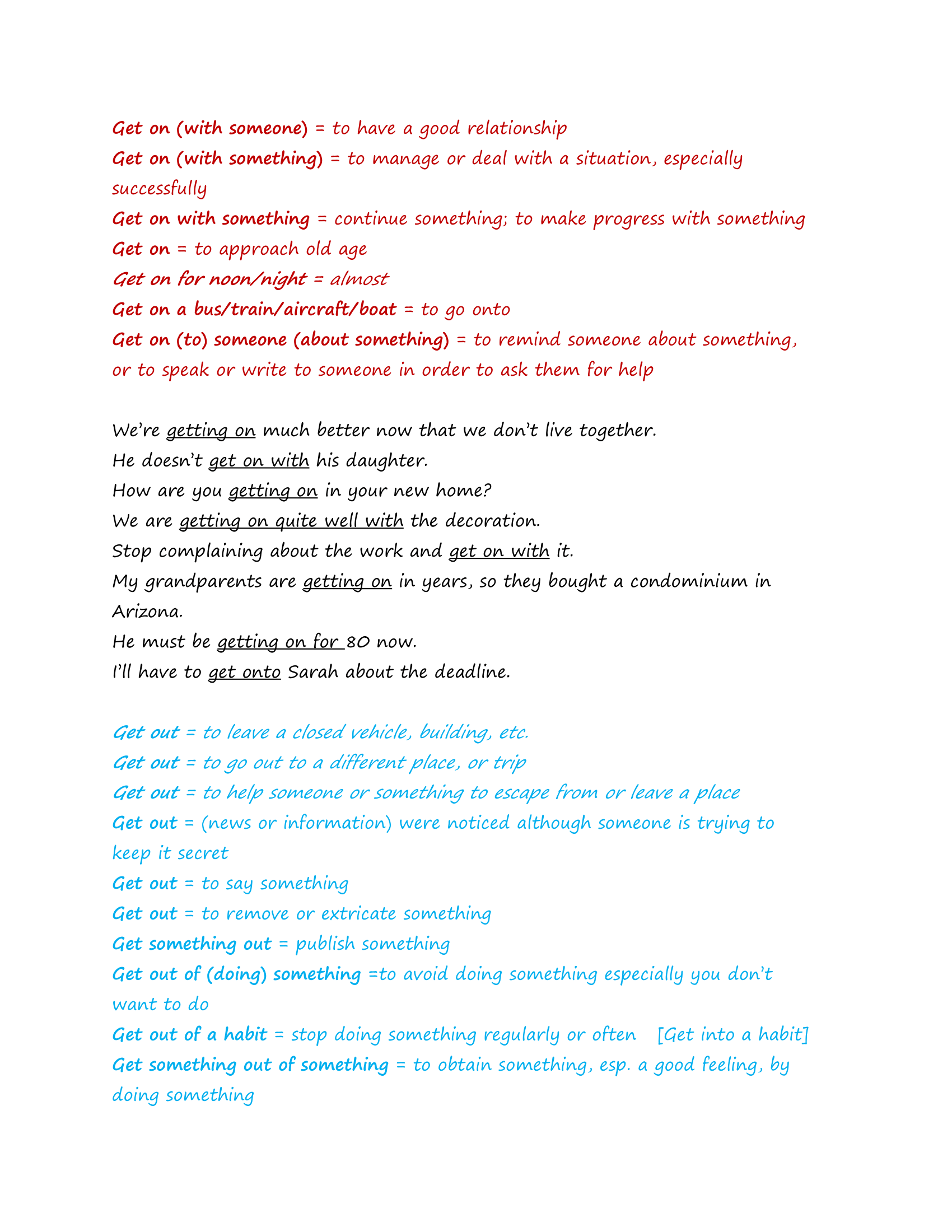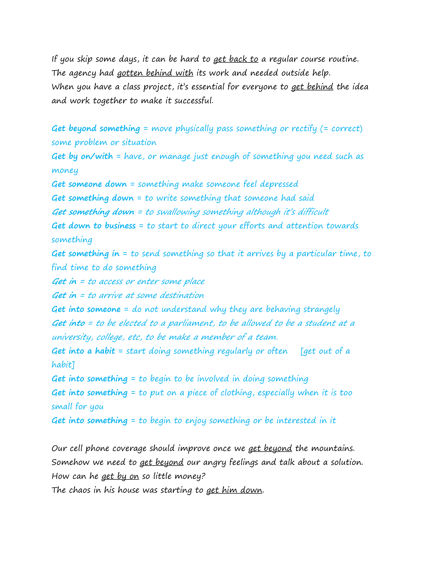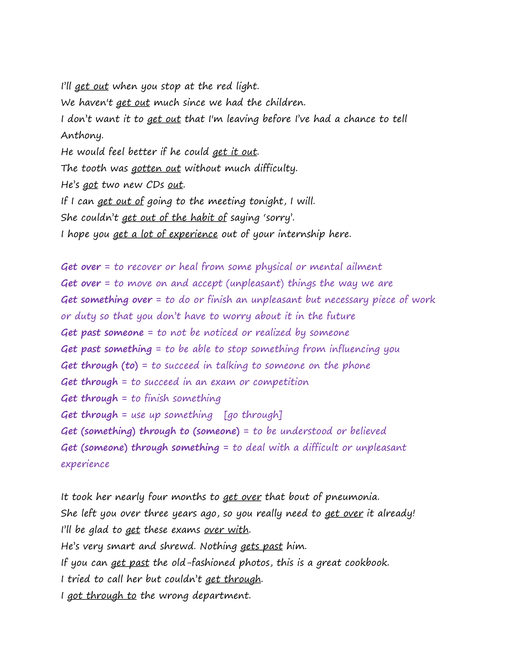 The important thing to remember is that a multi-word verb is still a verb. ‘Get’ is a verb. ‘Get up’, is also a verb, a different verb. ‘Get’ and ‘get up’ are two different verbs. They do not have the same meaning. So you should treat each multi-word verb verb as a separate verb and learn it like any other verb. Look at these examples. You can see that there are three types of multi-word verbs: