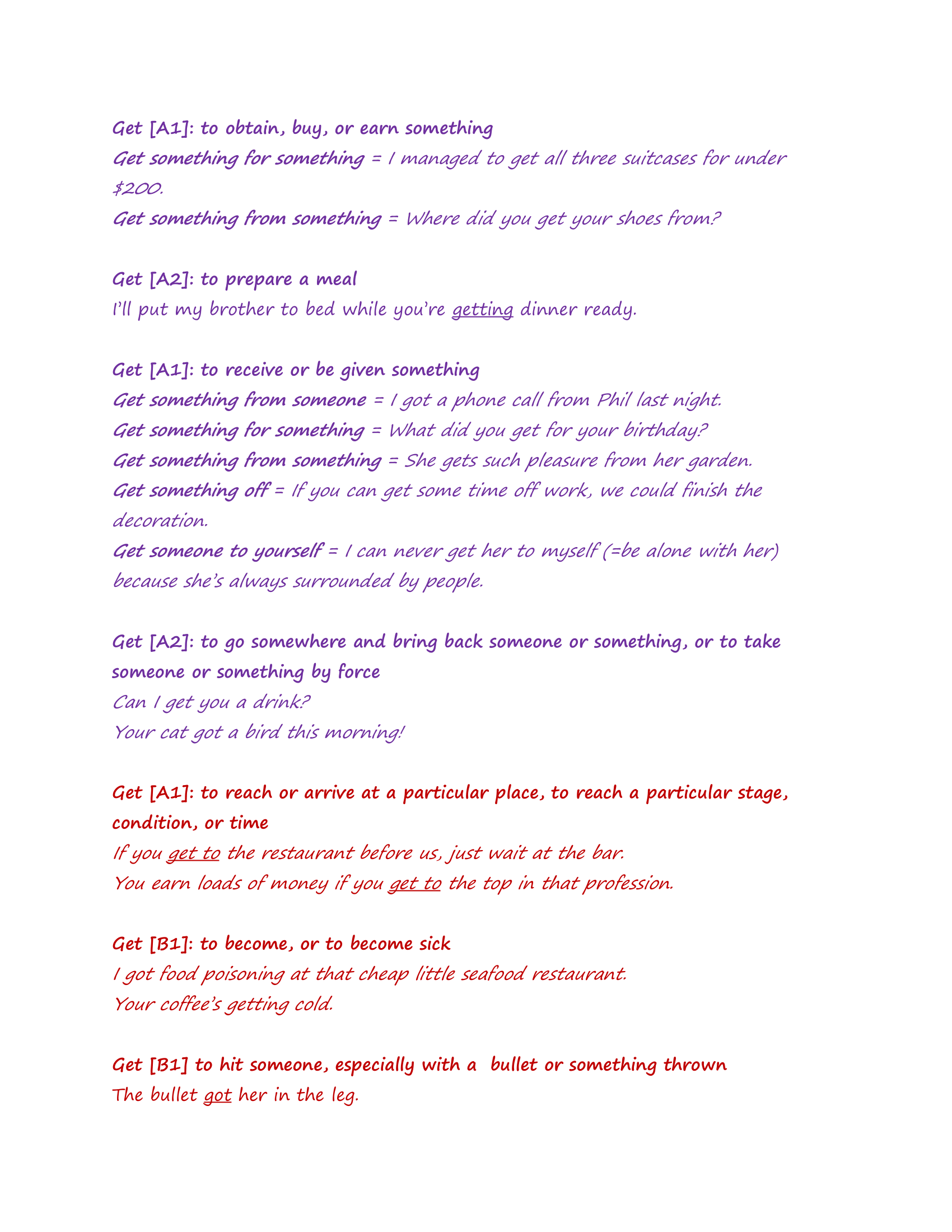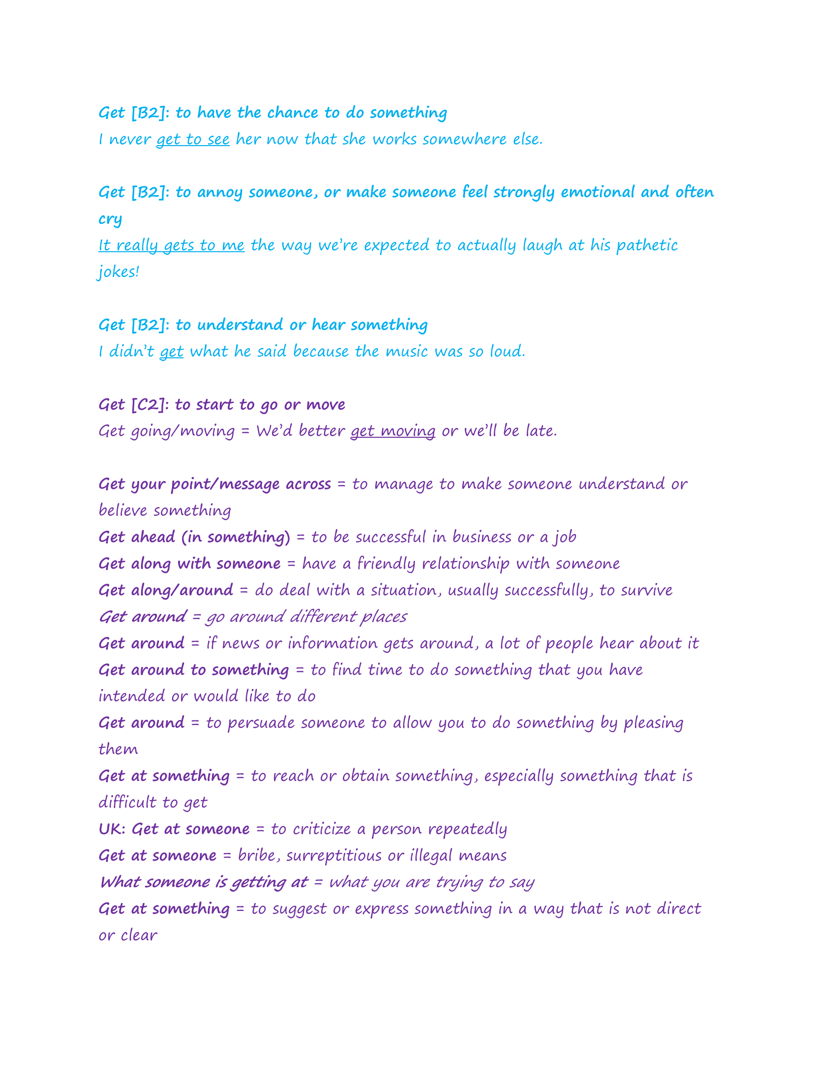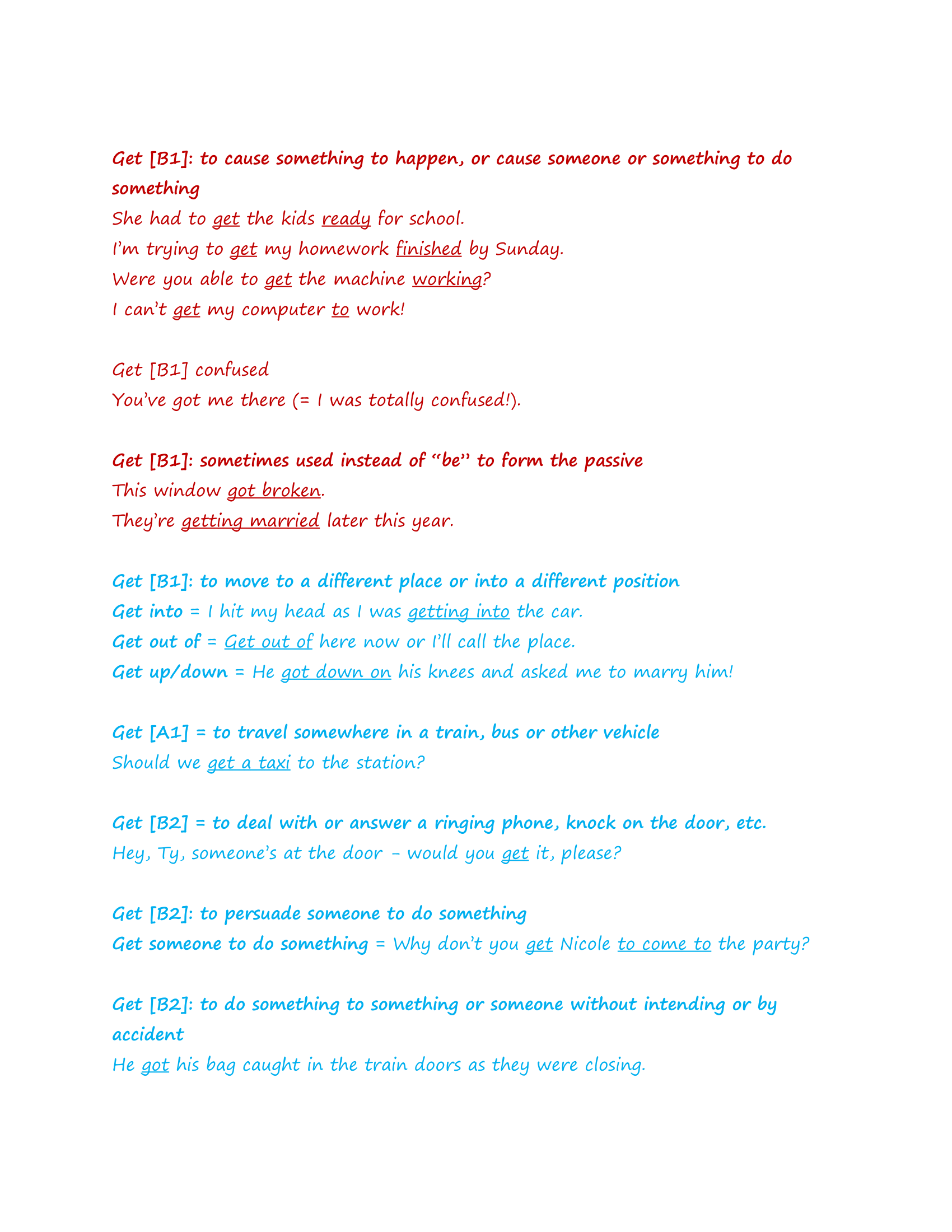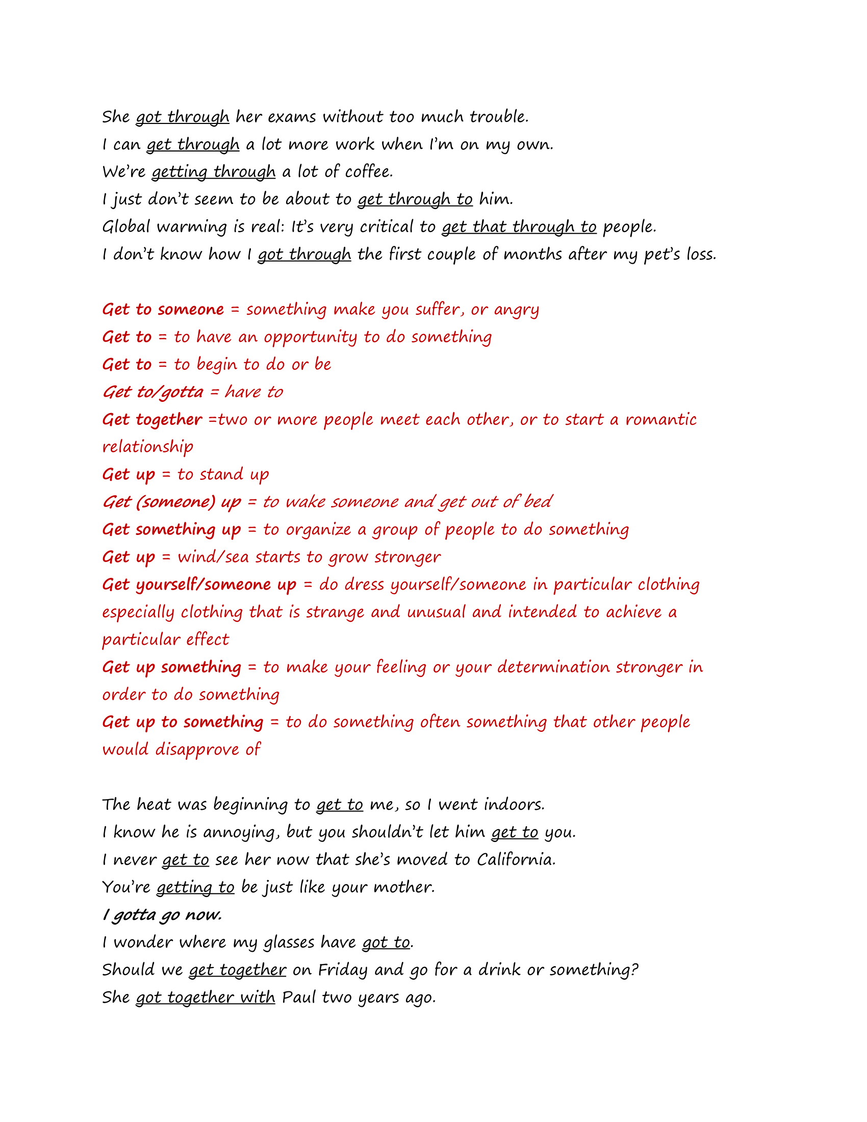 The important thing to remember is that a multi-word verb is still a verb. ‘Get’ is a verb. ‘Get up’, is also a verb, a different verb. ‘Get’ and ‘get up’ are two different verbs. They do not have the same meaning. So you should treat each multi-word verb verb as a separate verb and learn it like any other verb. Look at these examples. You can see that there are three types of multi-word verbs: