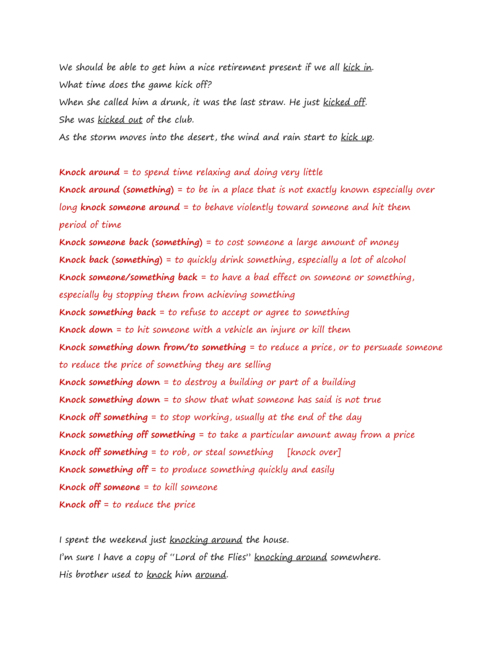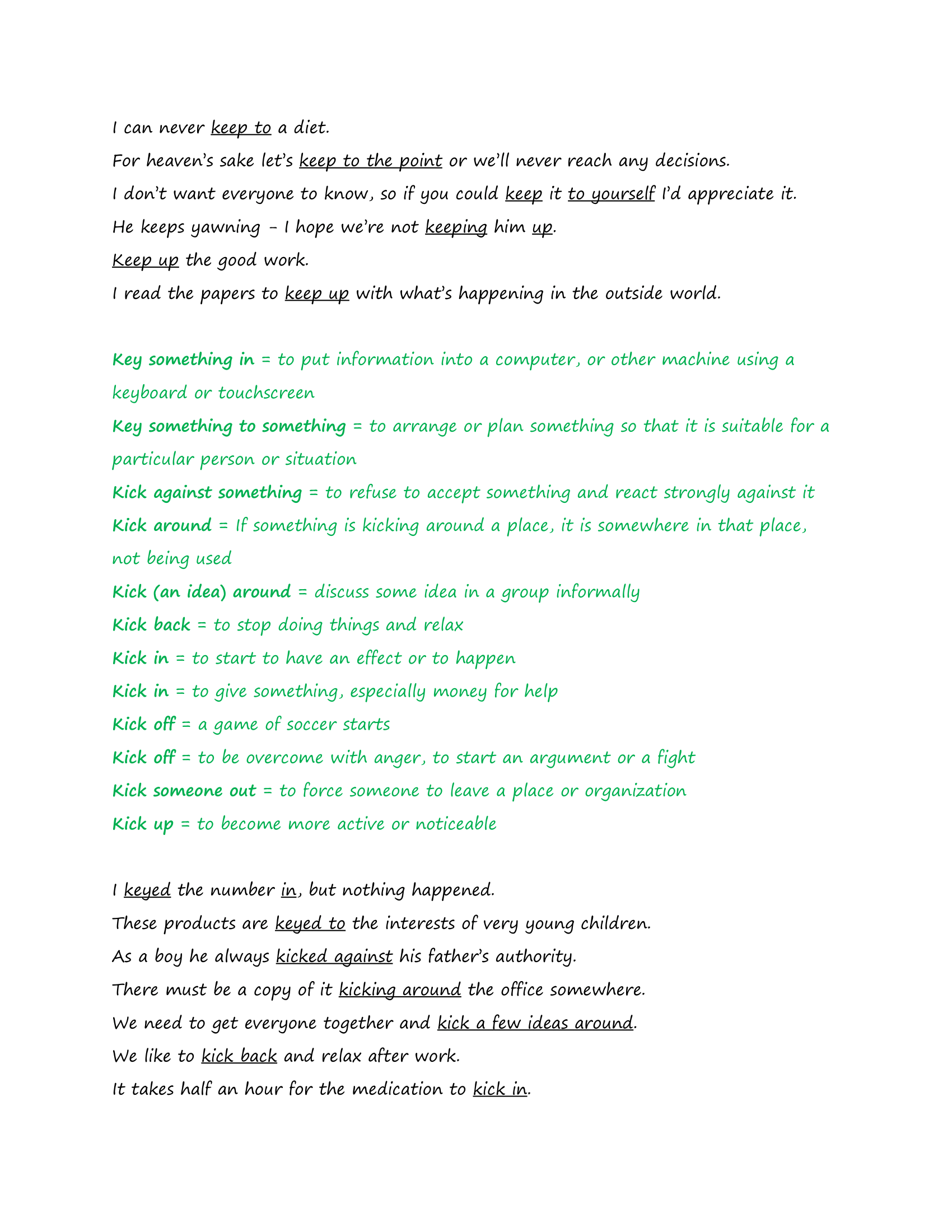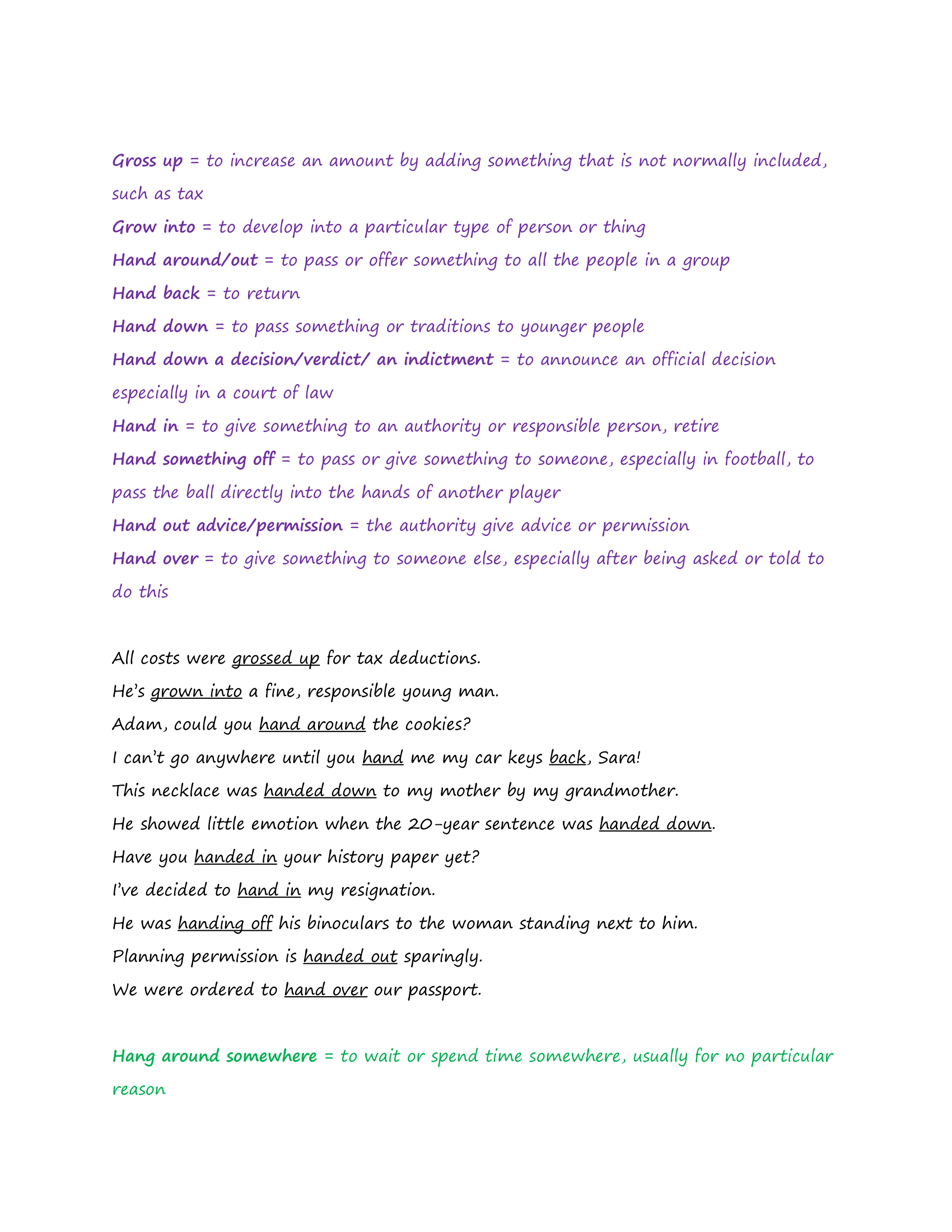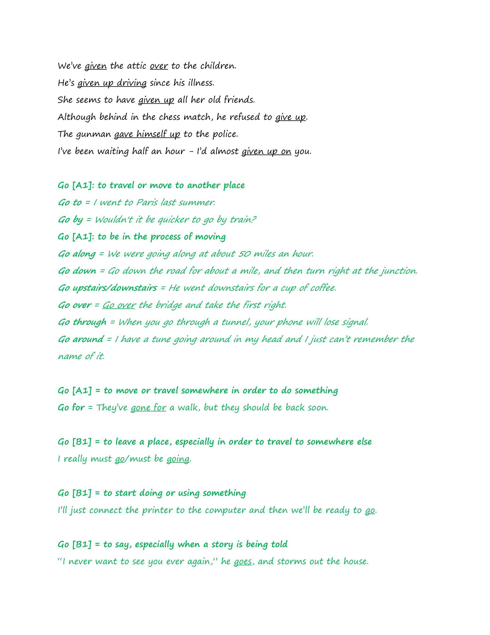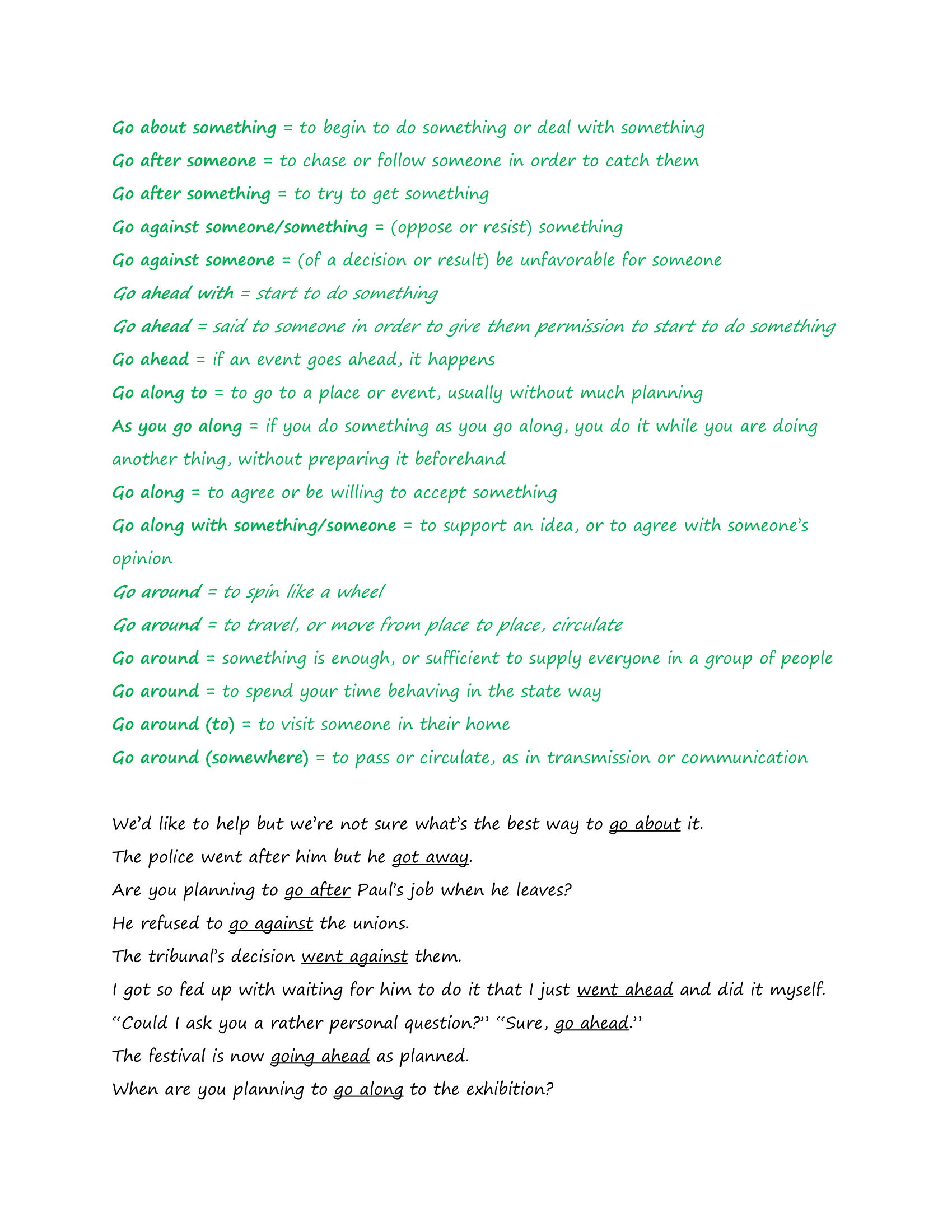 Phrasal verbs are part of a large group of verbs called ‘multi-word verbs’. Phrasal verbs and other multi-word verbs, including phrasal verbs, are very common, especially in Spoken English. A multi-word verb is a verb like ‘pick up’, ‘turn on’ or ’get on with’. For convenience, many people refer to all multi-word verbs as phrasal verbs. These verbs consist of a basic verb + another word or words. The other word(s) can be prepositions and/or adverbs. The two or three words that make up multi-word verbs form a short ‘phrase’ – which is why these verbs are often called ‘phrasal verbs’.