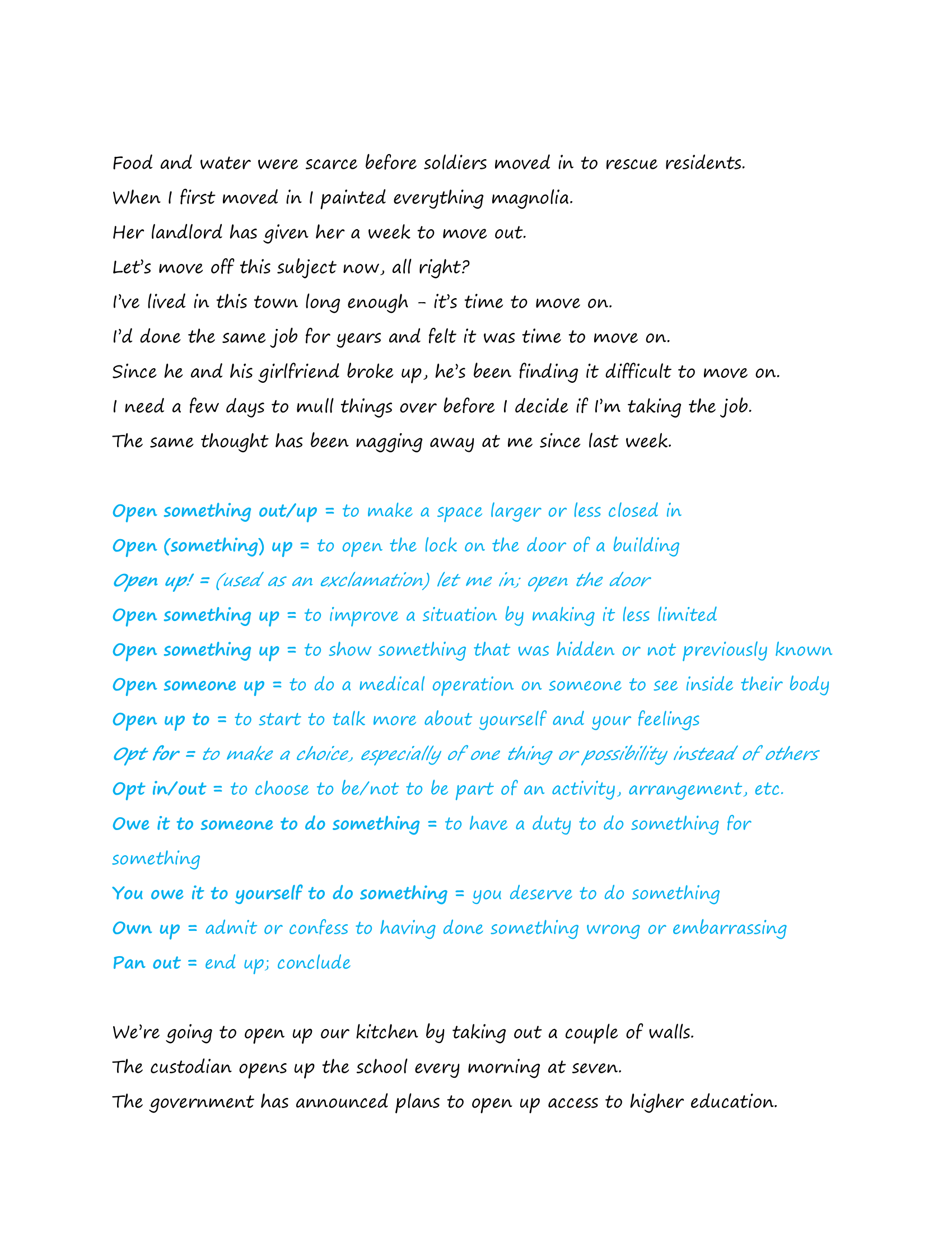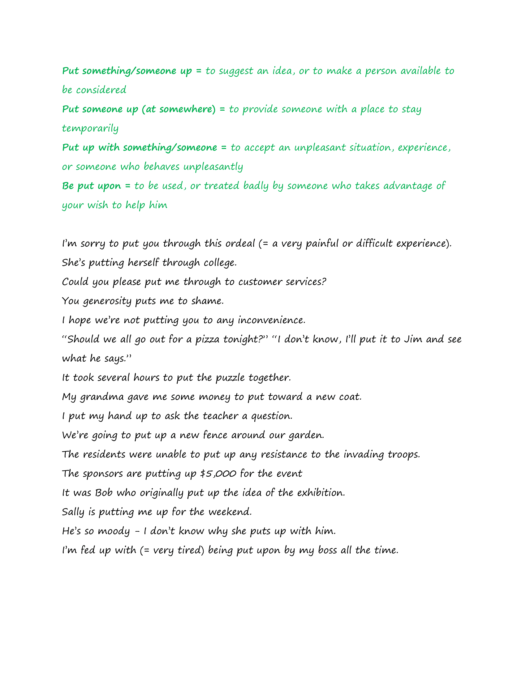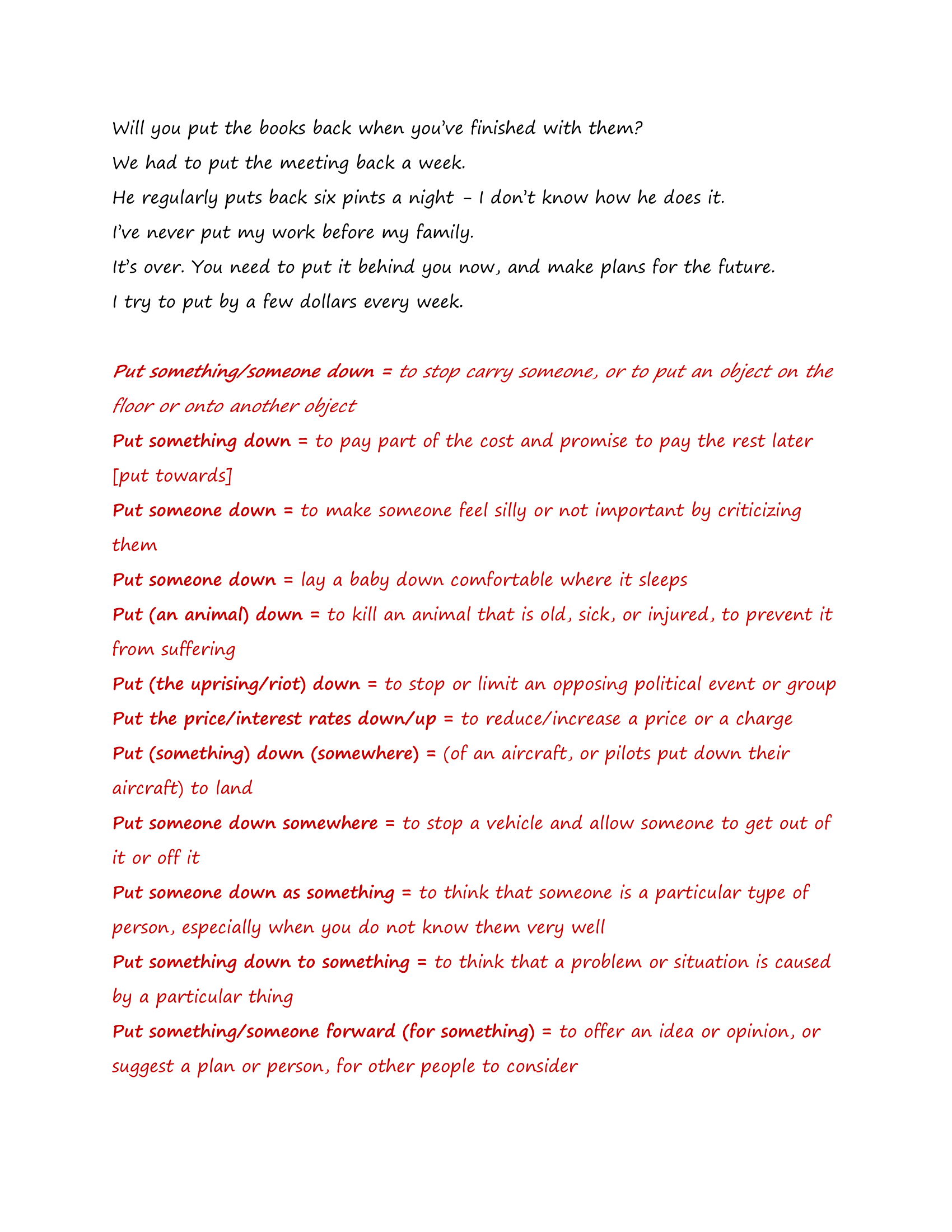 The important thing to remember is that a multi-word verb is still a verb. ‘Get’ is a verb. ‘Get up’, is also a verb, a different verb. ‘Get’ and ‘get up’ are two different verbs. They do not have the same meaning. So you should treat each multi-word verb verb as a separate verb and learn it like any other verb. Look at these examples. You can see that there are three types of multi-word verbs: