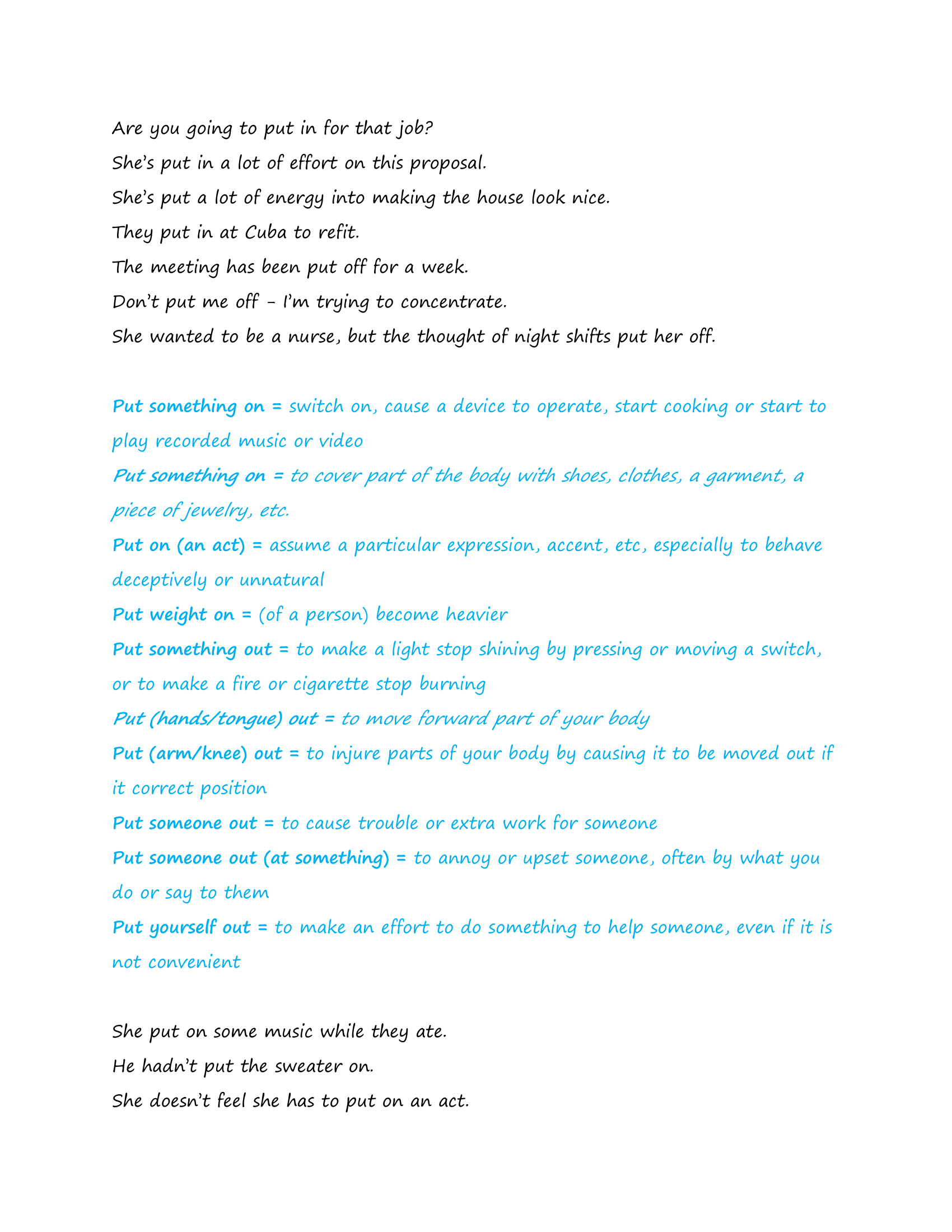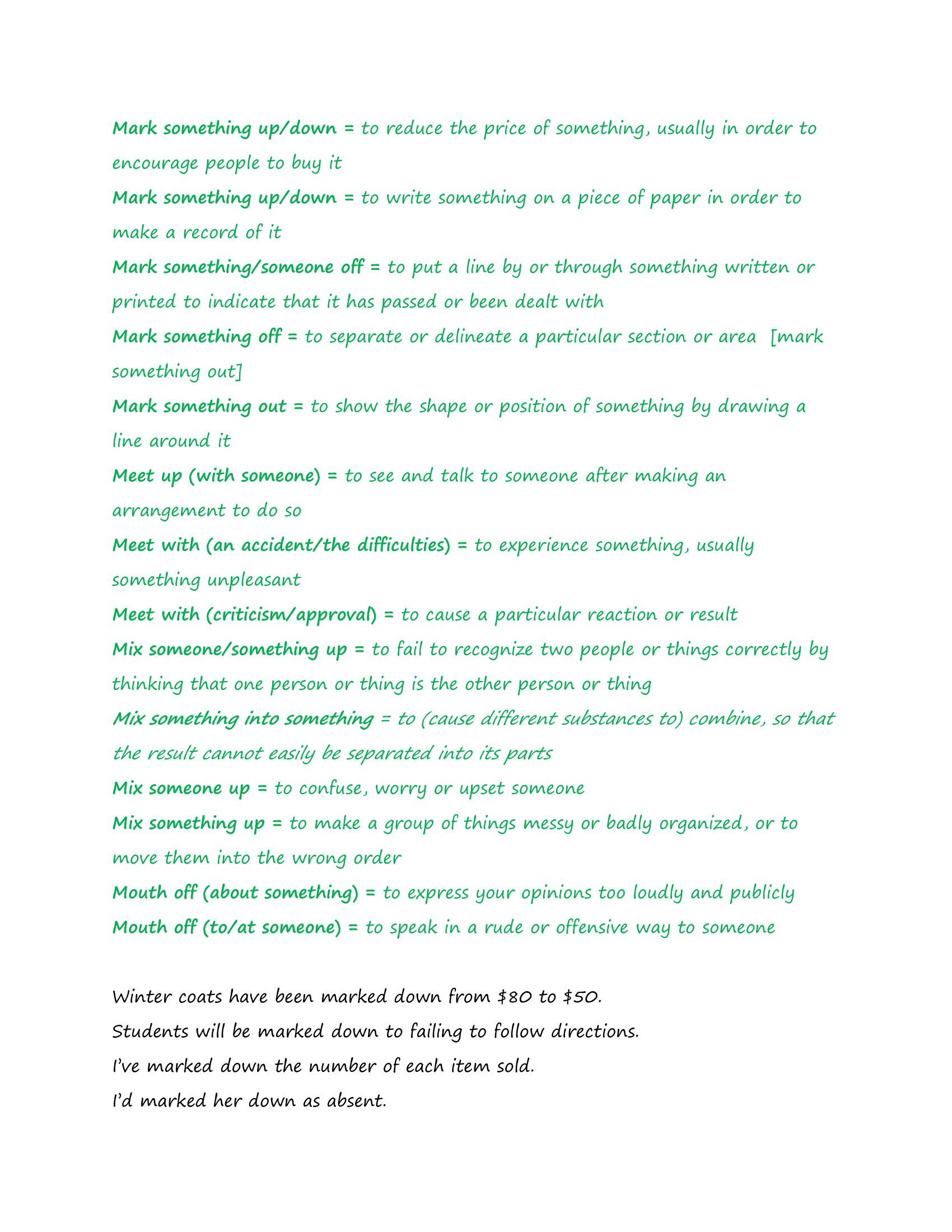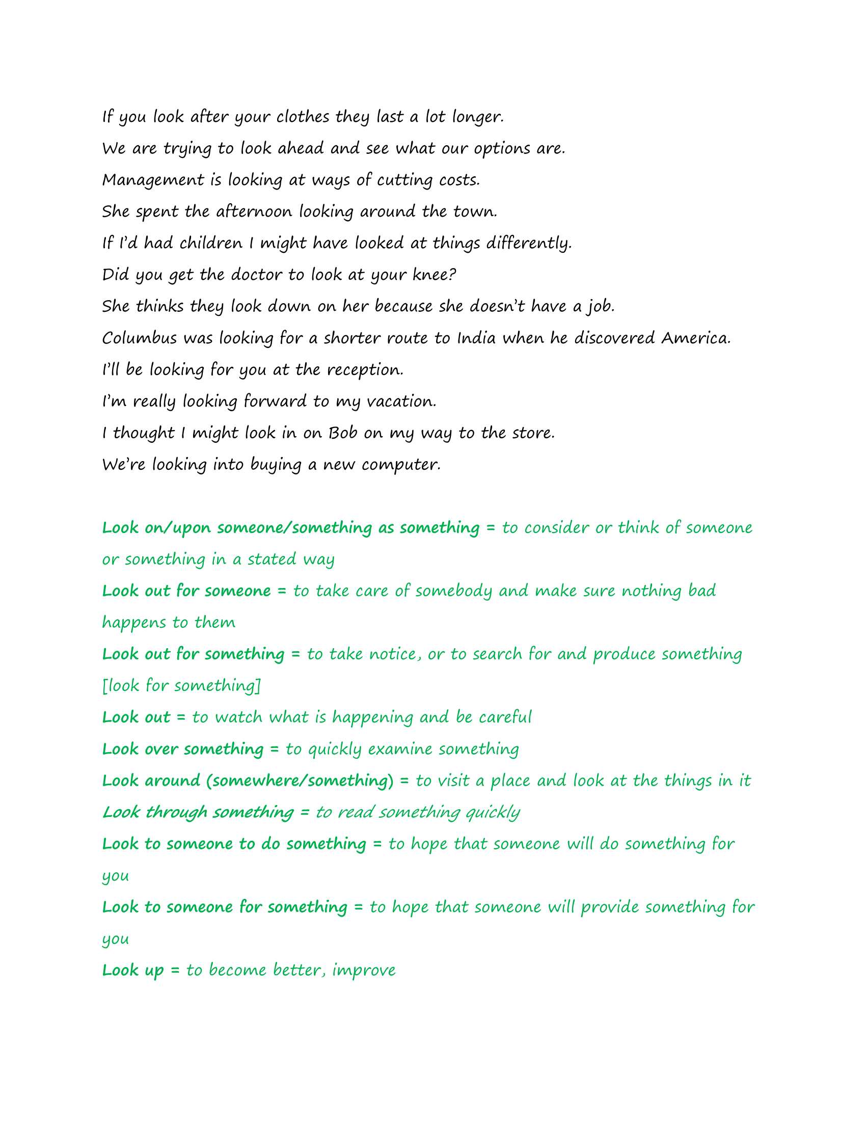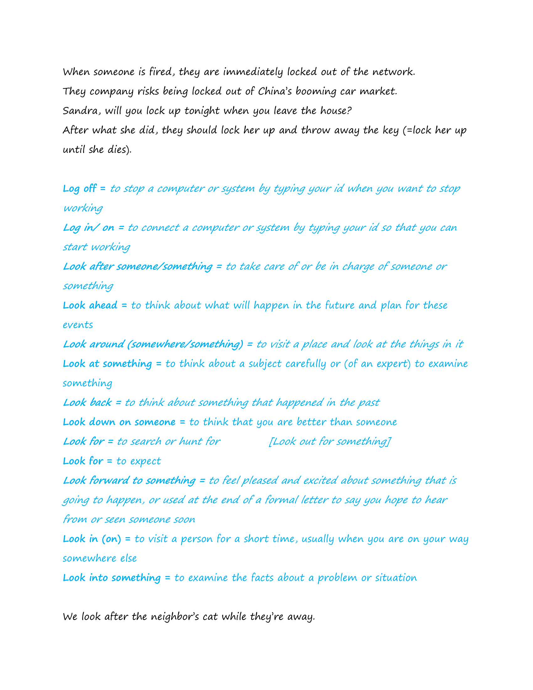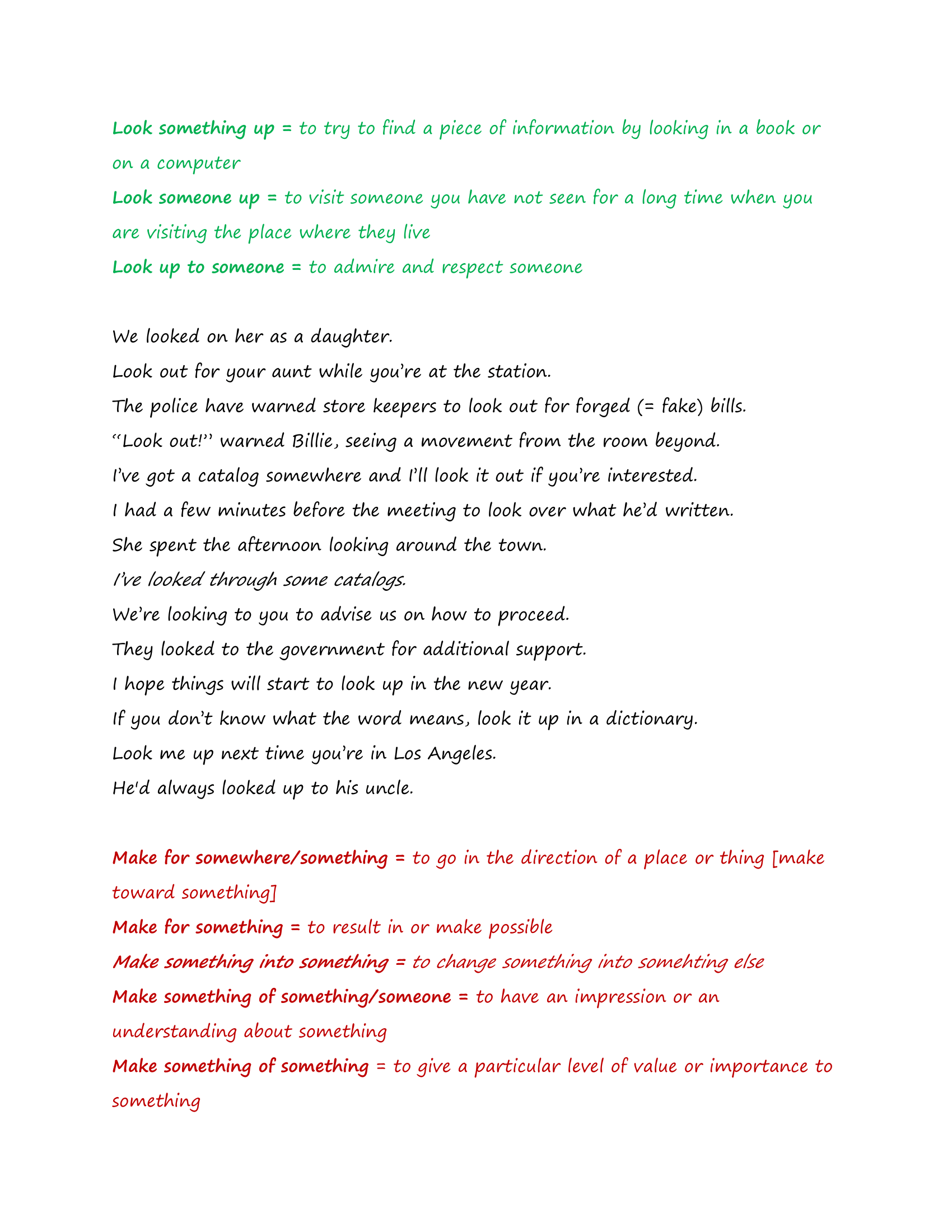 Phrasal verbs are part of a large group of verbs called ‘multi-word verbs’. Phrasal verbs and other multi-word verbs, including phrasal verbs, are very common, especially in Spoken English. A multi-word verb is a verb like ‘pick up’, ‘turn on’ or ’get on with’. For convenience, many people refer to all multi-word verbs as phrasal verbs. These verbs consist of a basic verb + another word or words. The other word(s) can be prepositions and/or adverbs. The two or three words that make up multi-word verbs form a short ‘phrase’ – which is why these verbs are often called ‘phrasal verbs’.