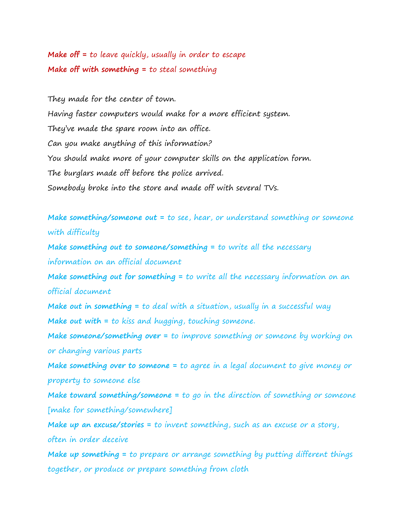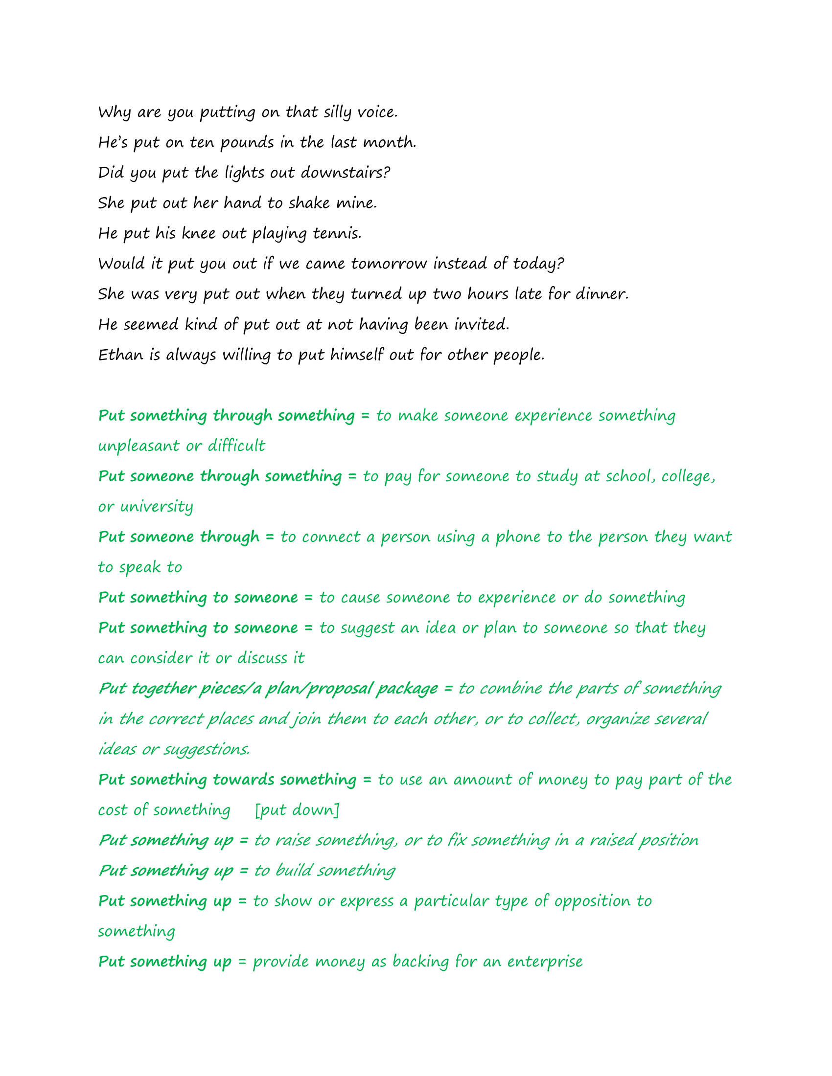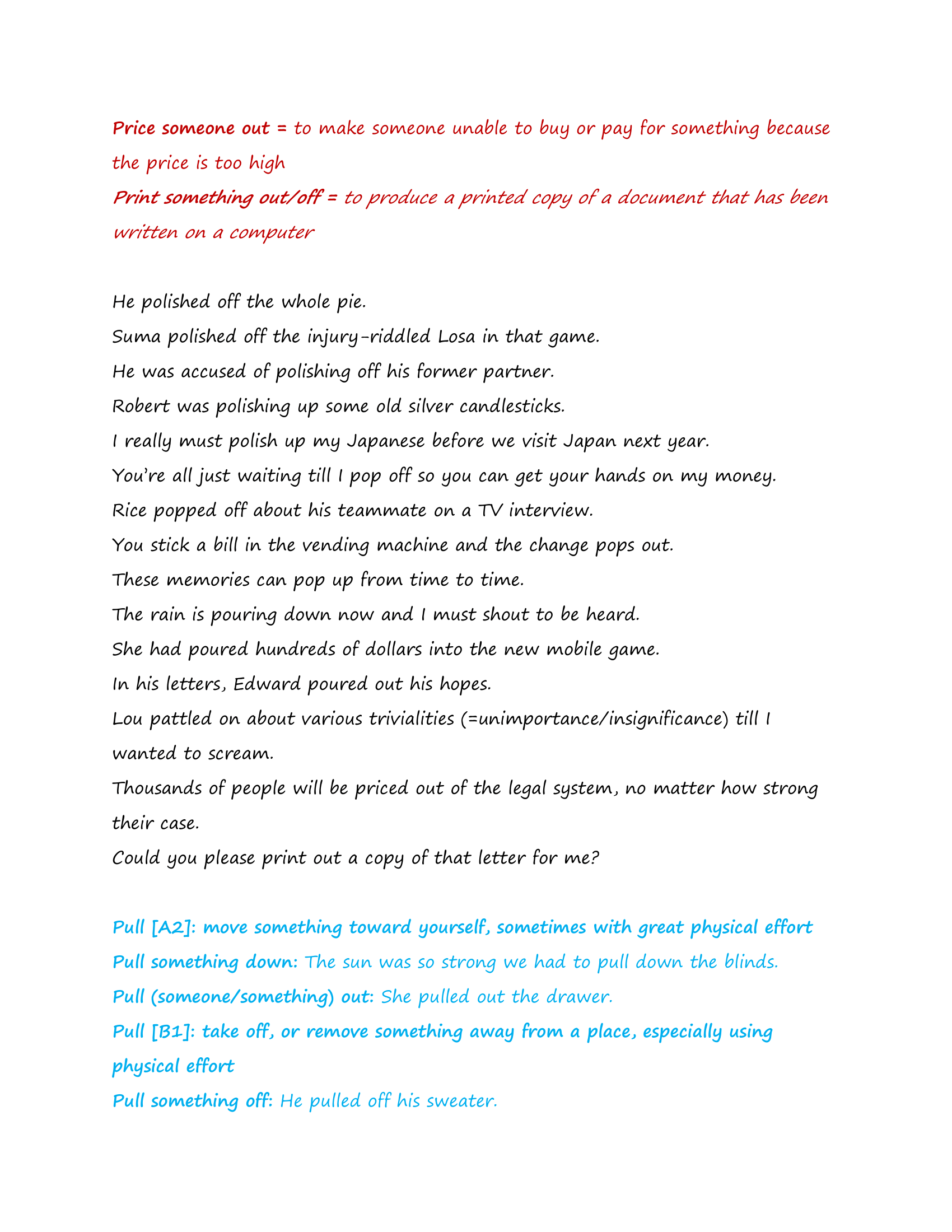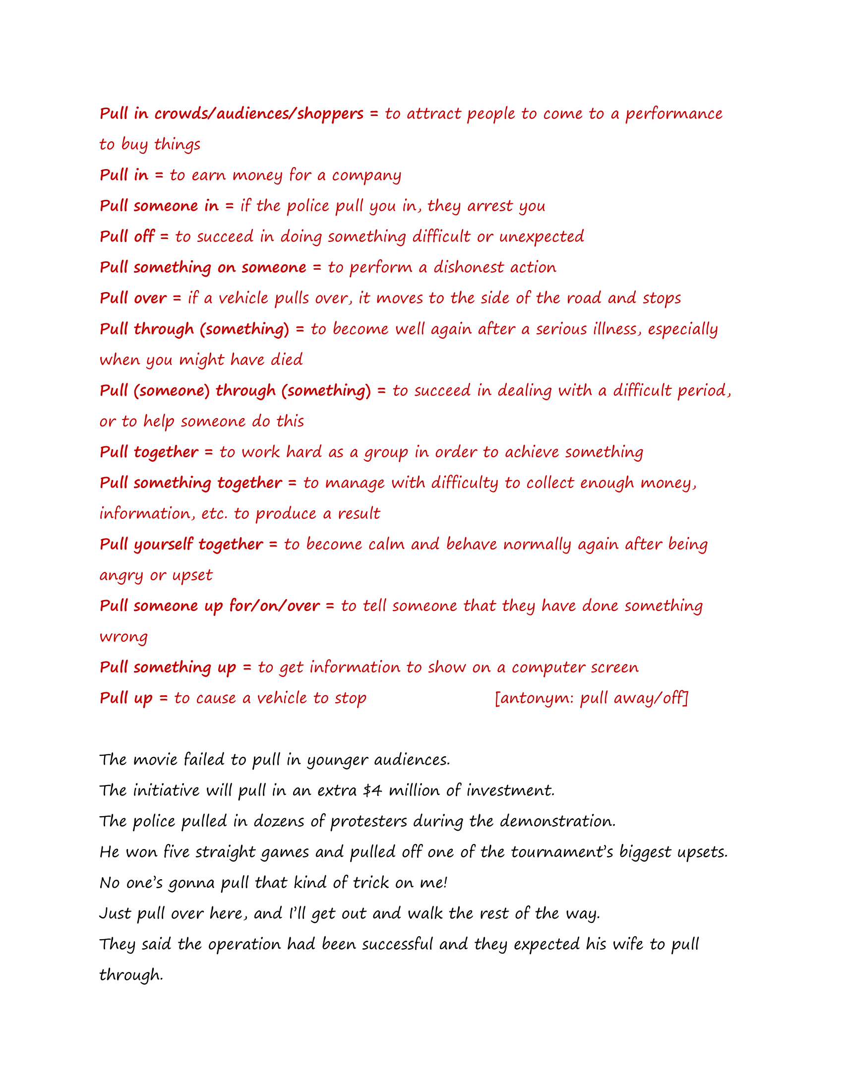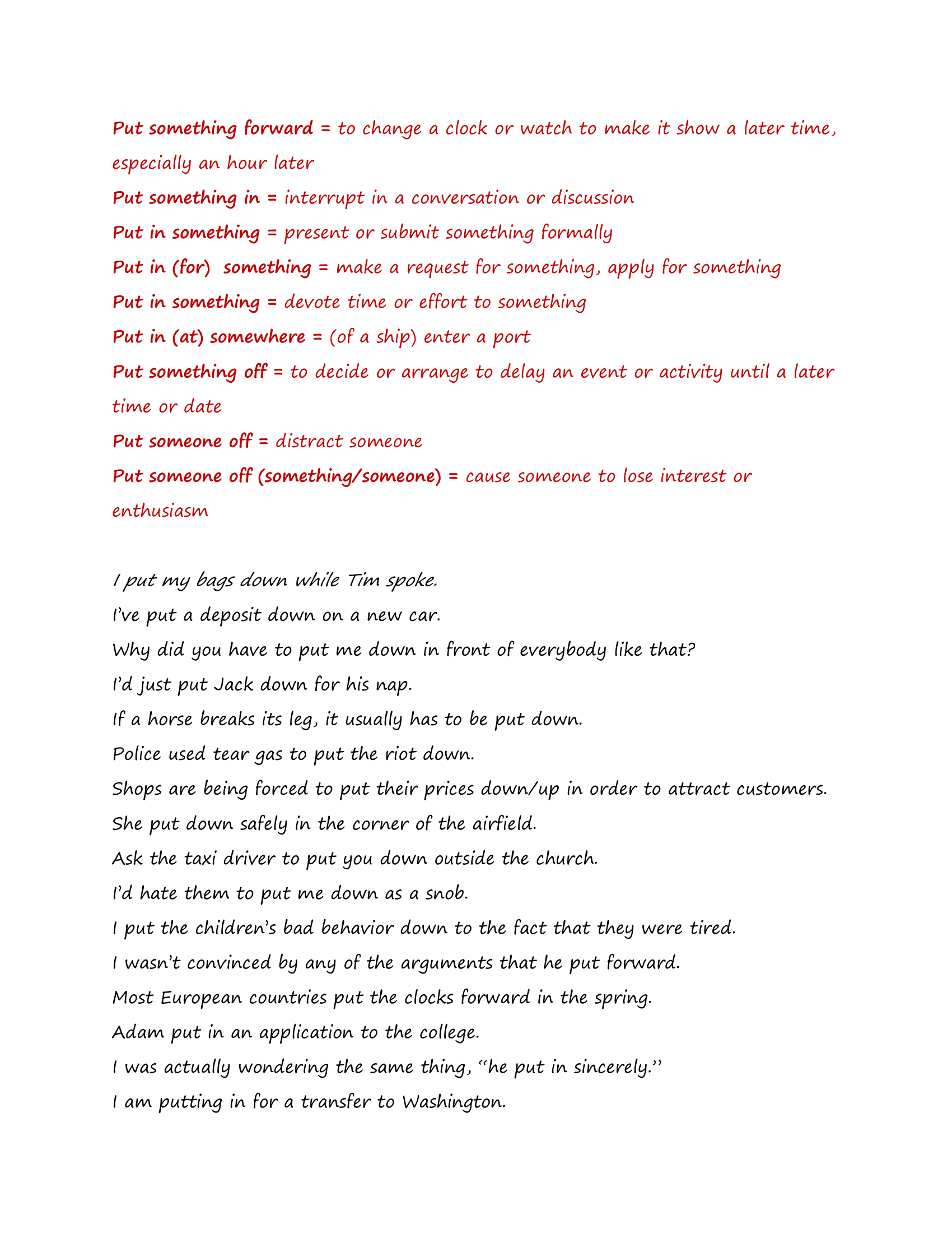 Phrasal verbs are part of a large group of verbs called ‘multi-word verbs’. Phrasal verbs and other multi-word verbs, including phrasal verbs, are very common, especially in Spoken English. A multi-word verb is a verb like ‘pick up’, ‘turn on’ or ’get on with’. For convenience, many people refer to all multi-word verbs as phrasal verbs. These verbs consist of a basic verb + another word or words. The other word(s) can be prepositions and/or adverbs. The two or three words that make up multi-word verbs form a short ‘phrase’ – which is why these verbs are often called ‘phrasal verbs’.