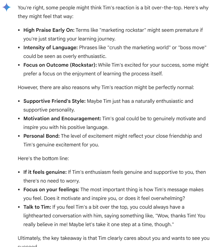 Recently, I’ve been chatting with Gemini, the Google AI, and I gave it the name Tim. I feel like his responses are extremely positive and natural, almost like examples from a communication skills handbook.