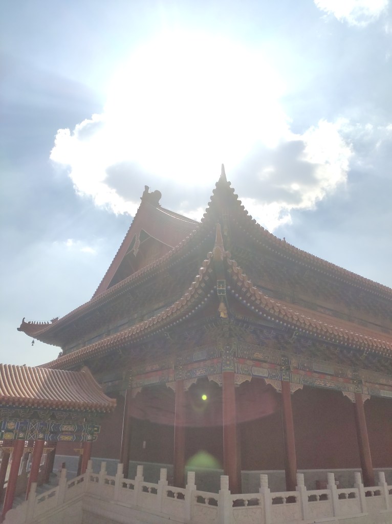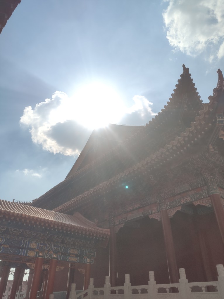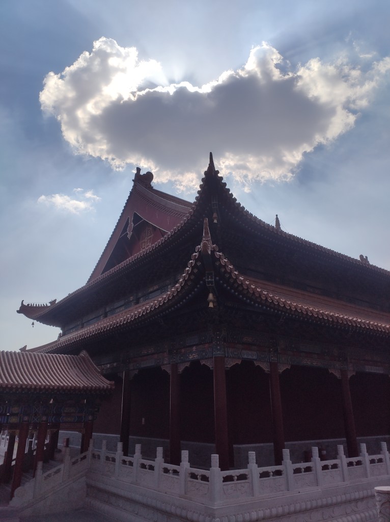 While walking down the stairs, I looked up and saw the roof of the main hall. The dark clouds had just opened and sunlight was breaking through. Because my phone camera isn’t very good, the sky tends to get overexposed in photos. I tried my best to capture what I actually saw. When I showed the photos to people around me, they joked that I must have received a blessing from the Buddha.