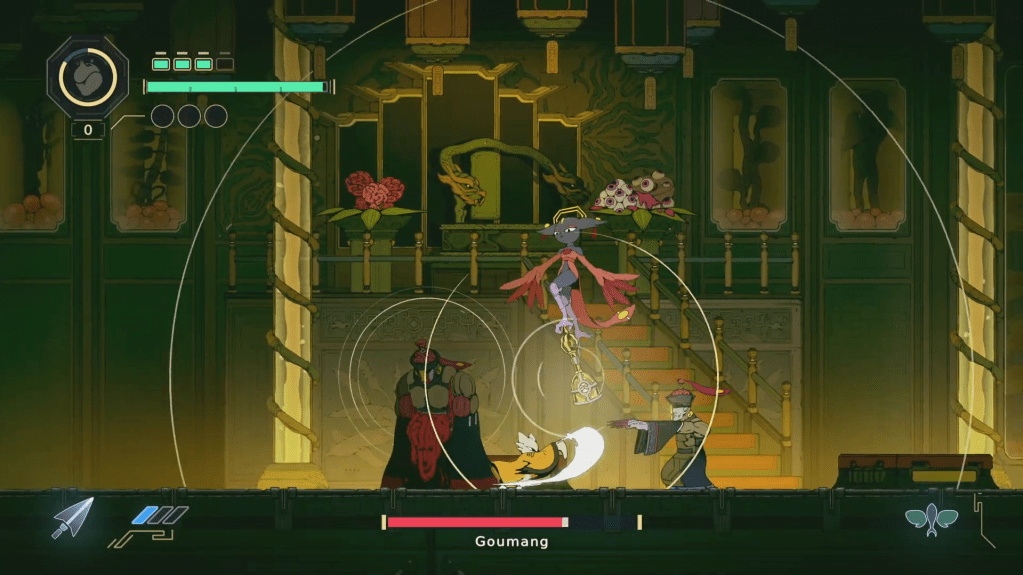 I got to the second boss in Nine Sols yesterday—Goumang, a Solar like the protagonist. At first, she reads like a standard antagonist. Even the way she eats those eye-like grapes feels controlled and a bit unsettling. The setup points to ambition and control: she’s turned two ape-people into zombies and uses them as tools. The fight backs that up—she shakes a bell to bring them back, and if I focus only on the zombies, she just keeps ringing it, reviving them over and over.